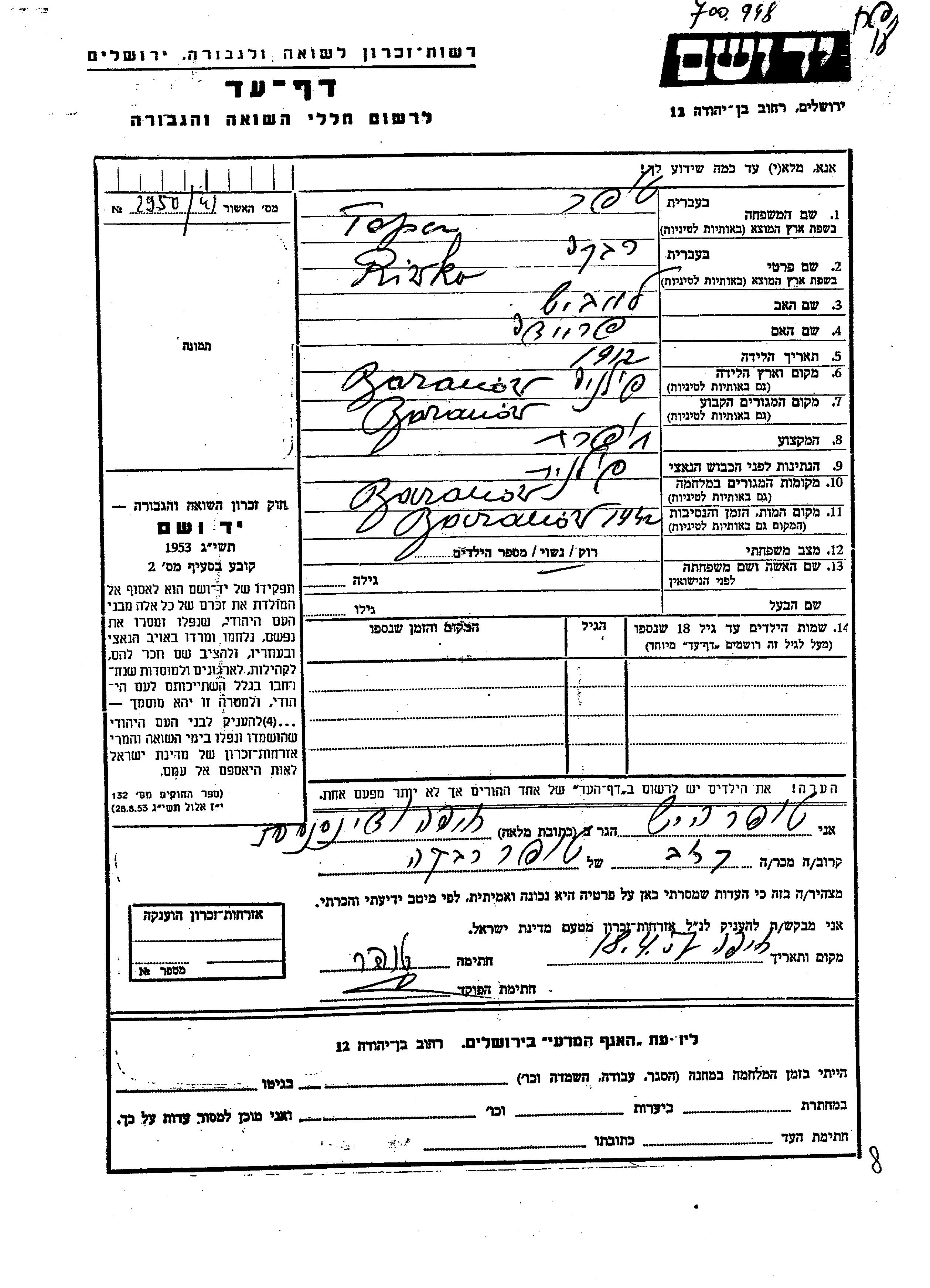 Riwka Toper wurde im Jahr 1912 in Baranov, Polen geboren. Sie war die Tochter von Leibish und Freida. Sie war Schneiderin und Verheiratet. Vor dem Zweiten Weltkrieg lebte sie in Baranov, Polen. Während des Krieges war sie in Baranov, Polen.
