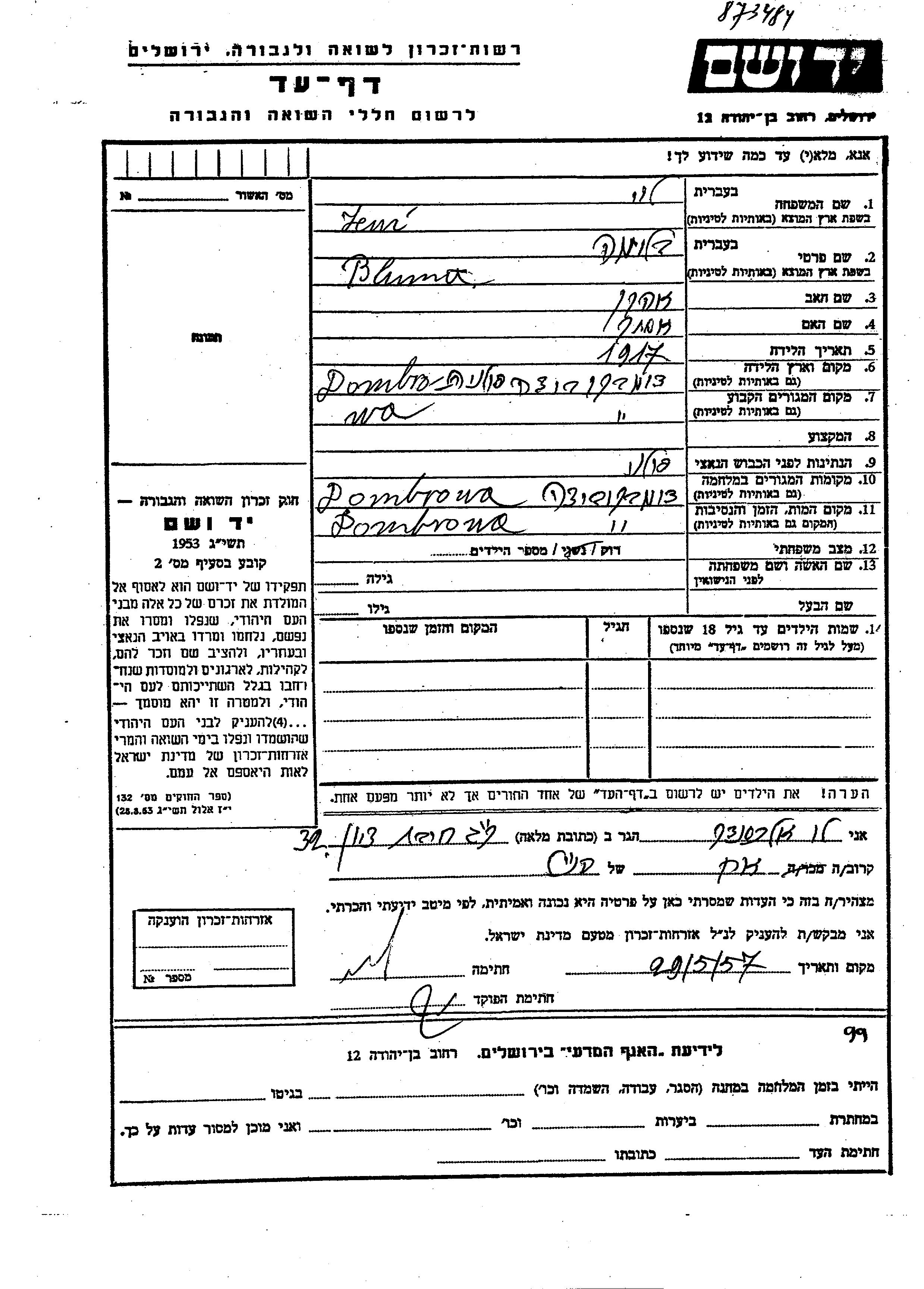 Bluma Levi wurde im Jahr 1917 in Dombrowice, Polen geboren. Sie war die Tochter von Aharon und Ester. Sie war Ledig. Vor dem Zweiten Weltkrieg lebte sie in Dombrowice, Polen. Während des Krieges war sie in Dombrowice, Polen.