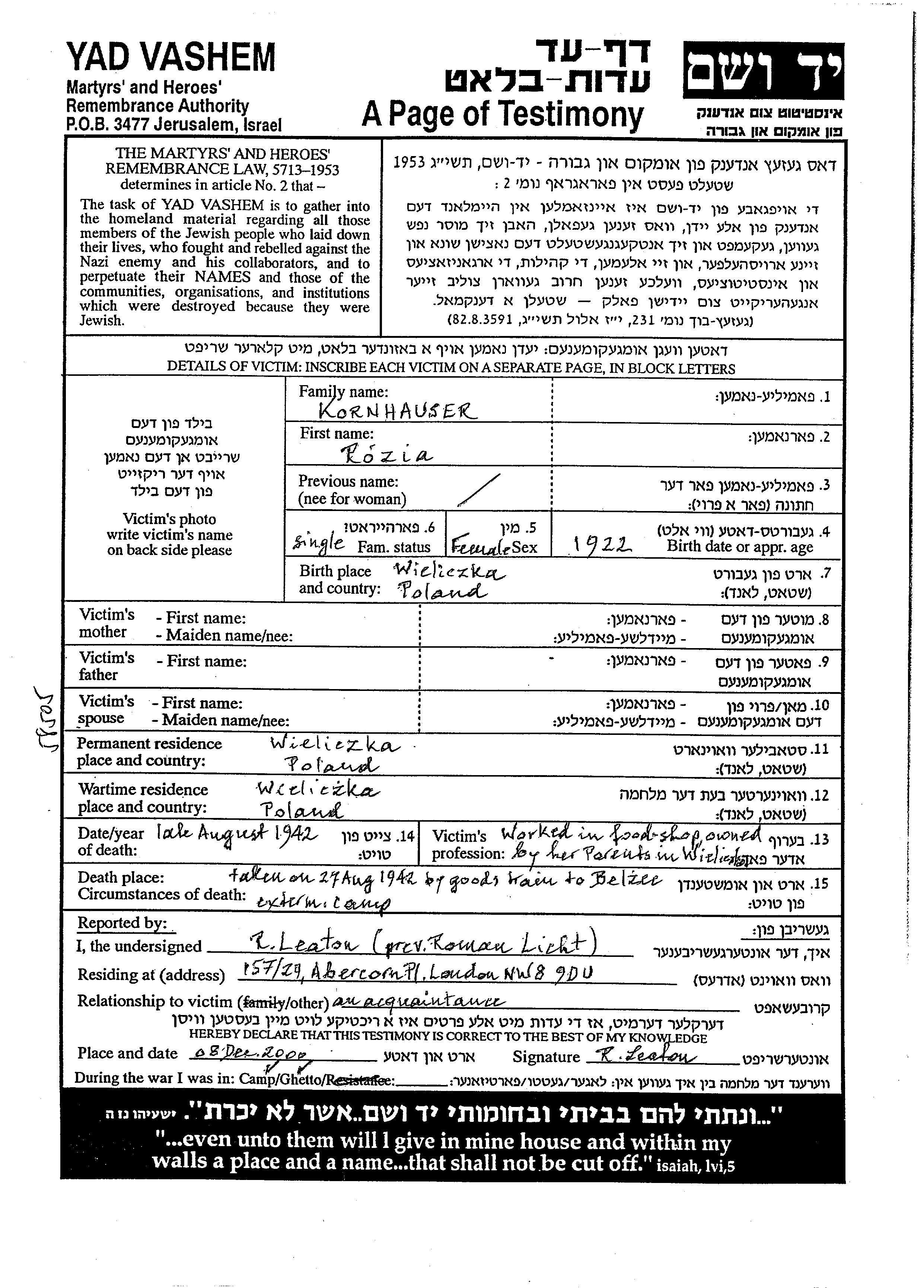 Rozia Kornhauser wurde im Jahr 1922 in Wieliczka, Polen geboren. Sie war Schuhverkäufer. Vor dem Zweiten Weltkrieg lebte sie in Wieliczka, Polen. Während des Krieges war sie in Wieliczka, Polen.