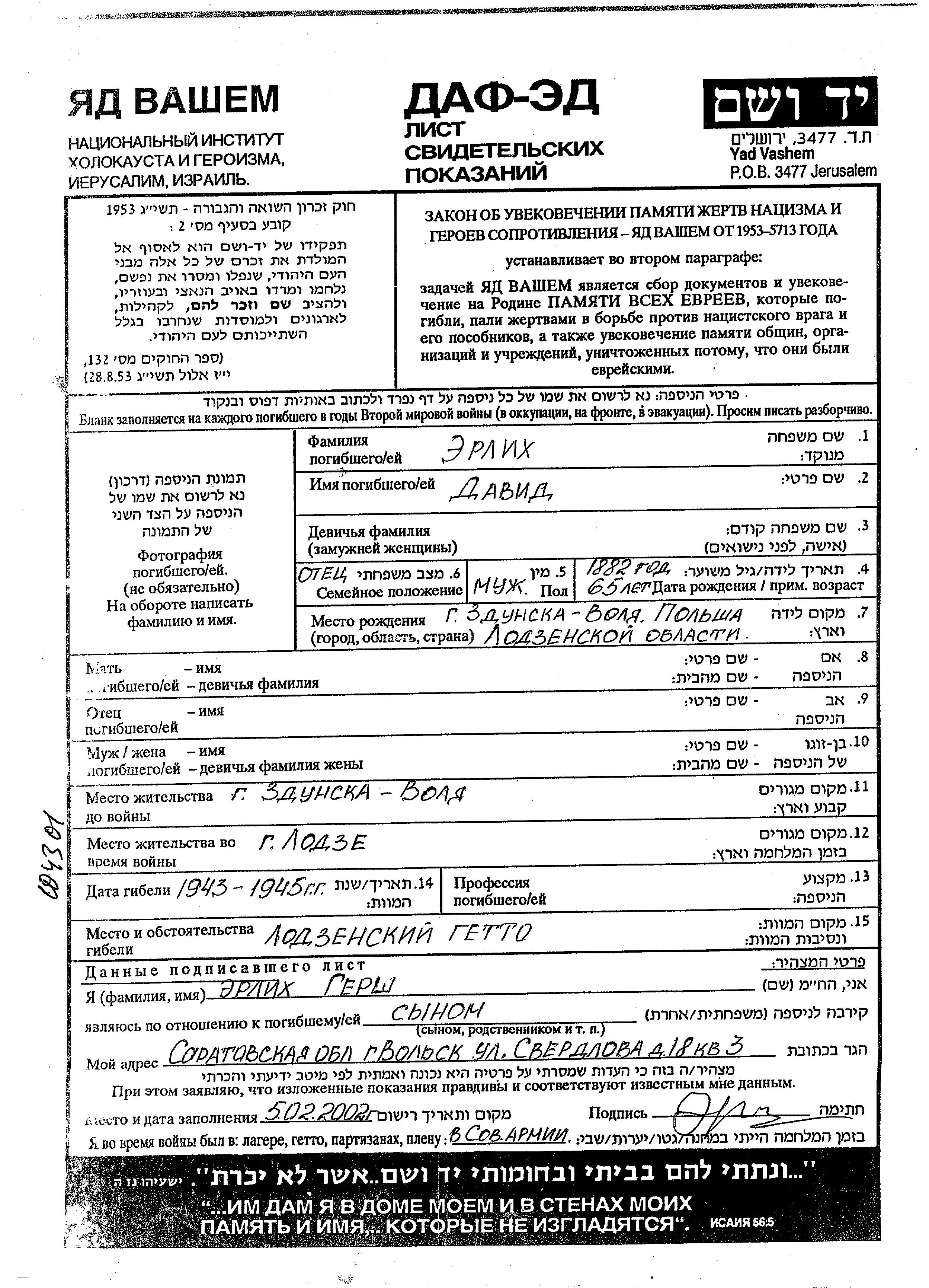 David Erlikh wurde in Zdunska Wola, Polen geboren. Er war Verheiratet. Vor dem Zweiten Weltkrieg lebte er in Zdunska Wola, Polen. Während des Krieges war er in Lodz, Polen.