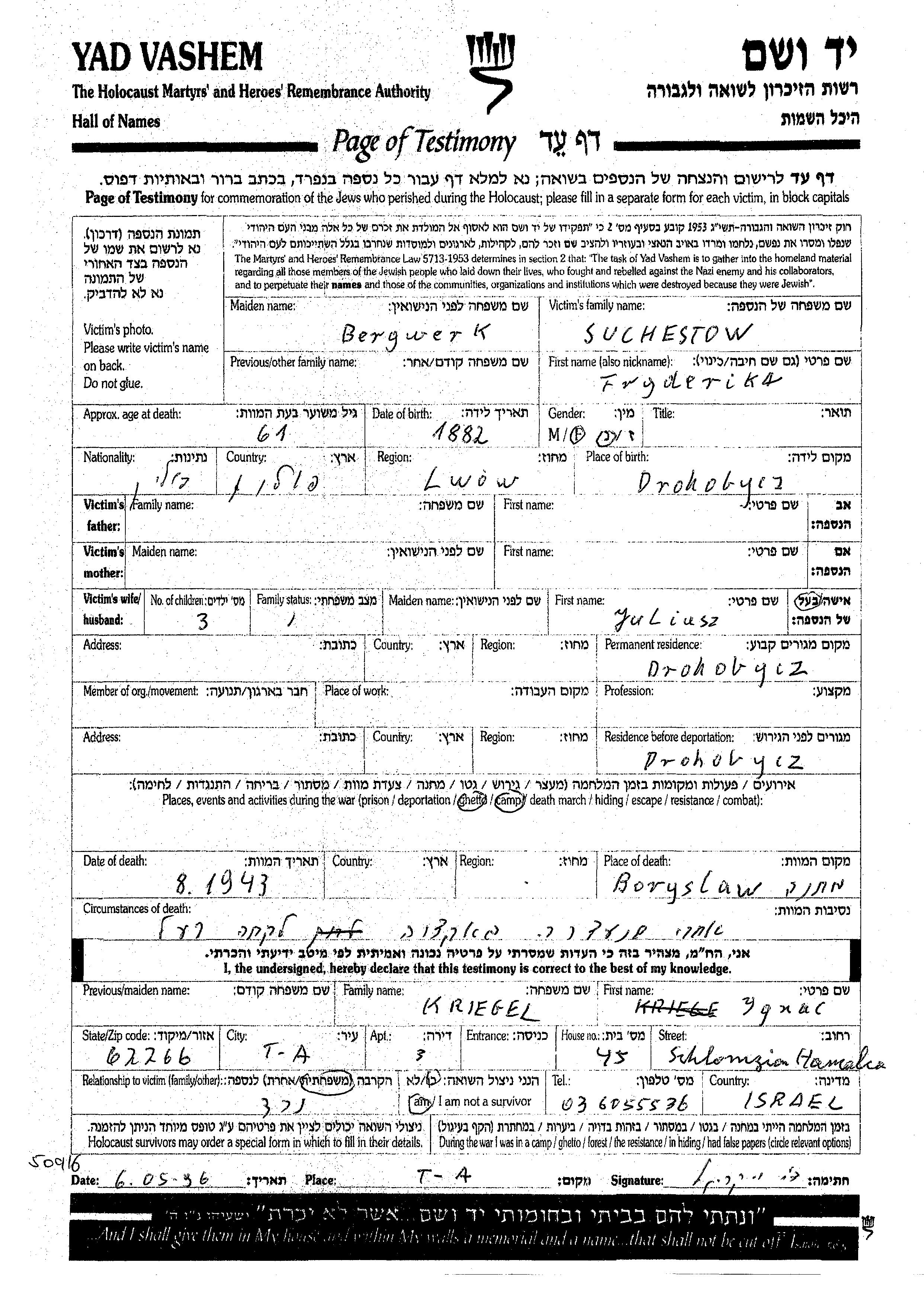 Fryderika Suchestow, geb. Bergwerk wurde im Jahr 1882 in Drohobycz, Polen geboren. Sie war mit Juliusz Verheiratet. Vor dem Zweiten Weltkrieg lebte sie in Drohobycz, Polen. Während des Krieges war sie in Drohobycz, Polen.