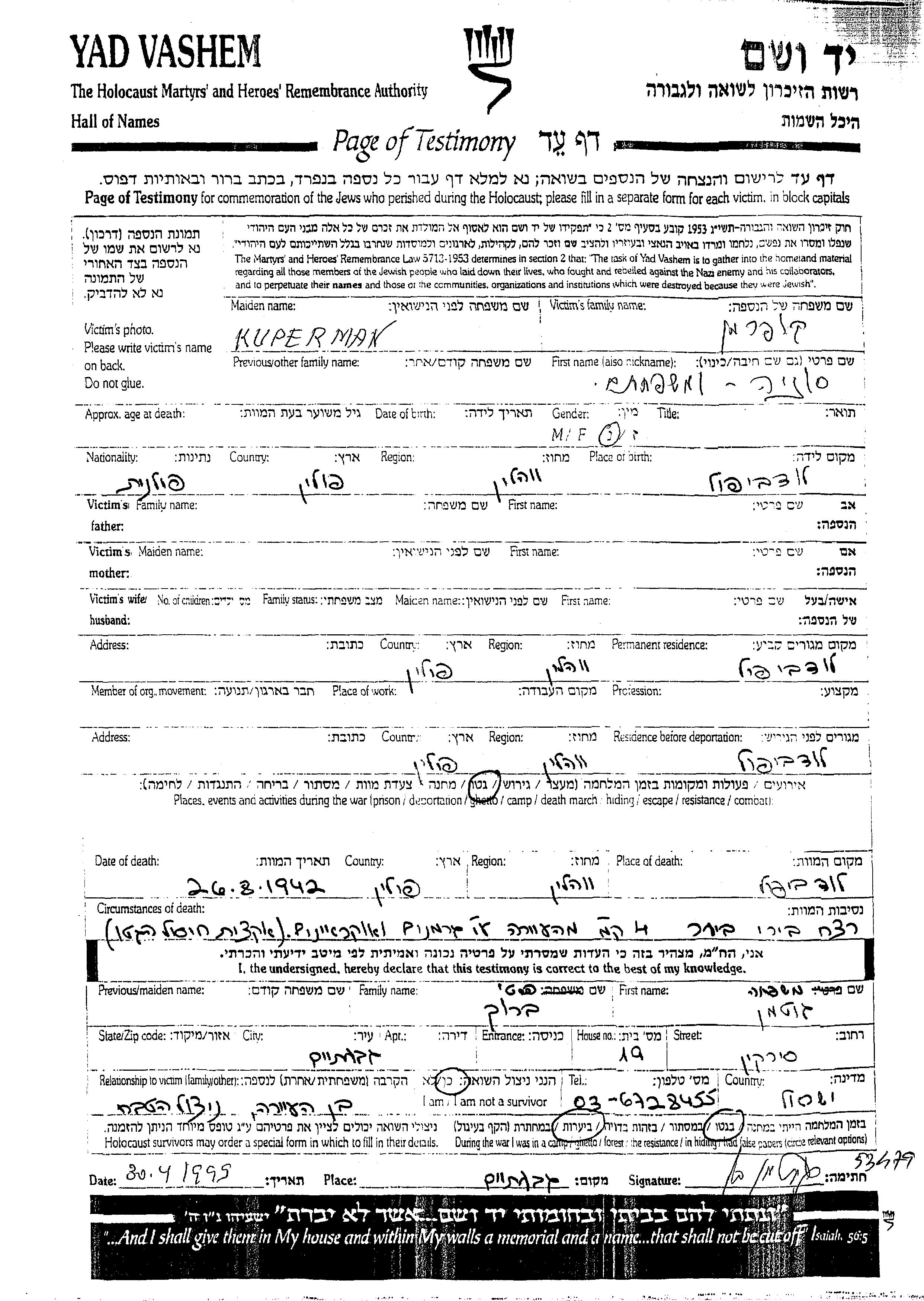 Kuperman Sonia Ludwipol, Polen Gedenkblatt