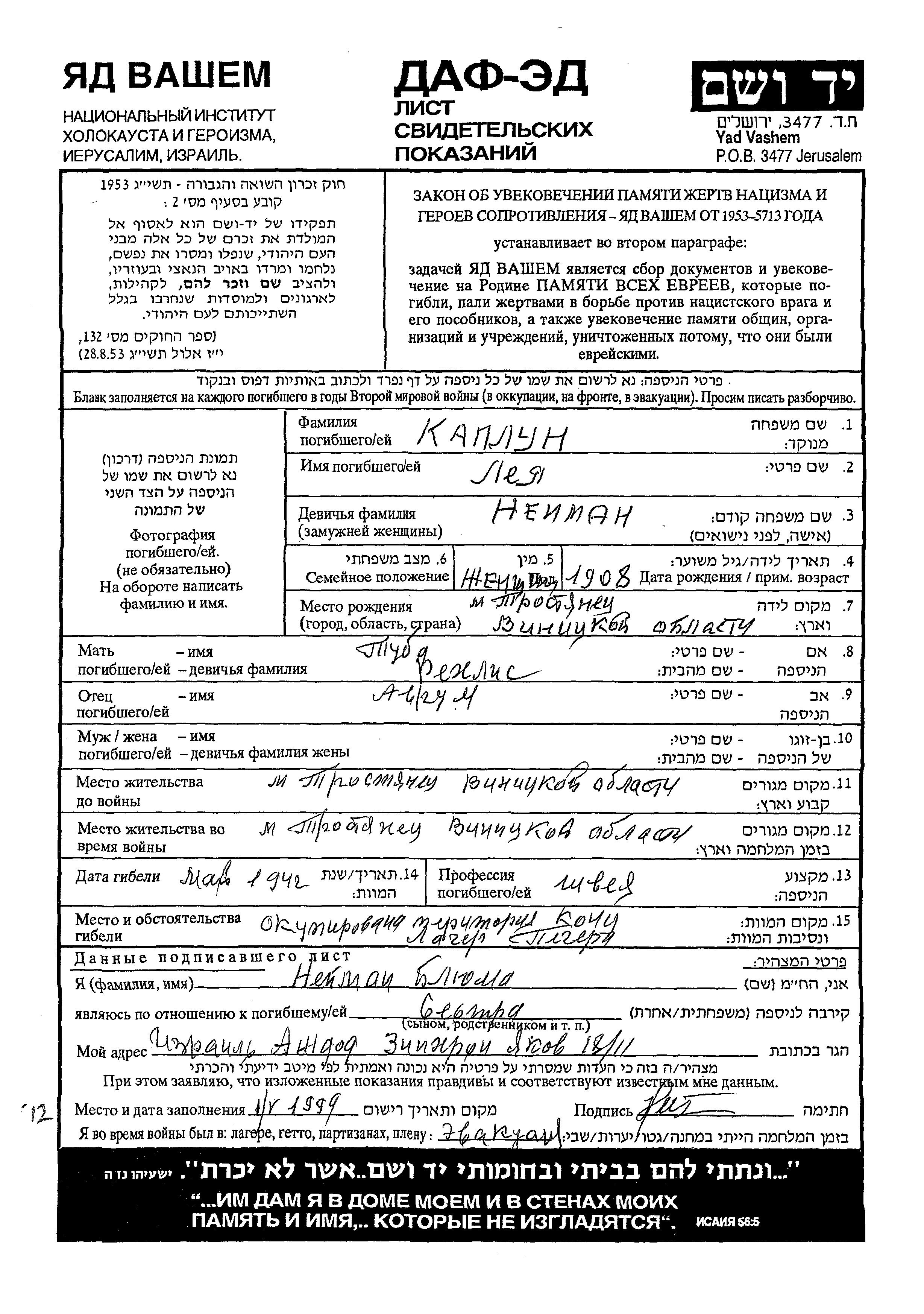 Lea Kaplun, geb. Neiman wurde im Jahr 1908 in Trostyanets, Ukraine (UdSSR) geboren. Sie war die Tochter von Avrum und Tuba, geb. Rekhelis Rekhlis. Sie war Schneiderin. Vor dem Zweiten Weltkrieg lebte sie in Trostyanets, Ukraine (UdSSR). Während des Krieges war sie in Trostyanets, Ukraine (UdSSR).