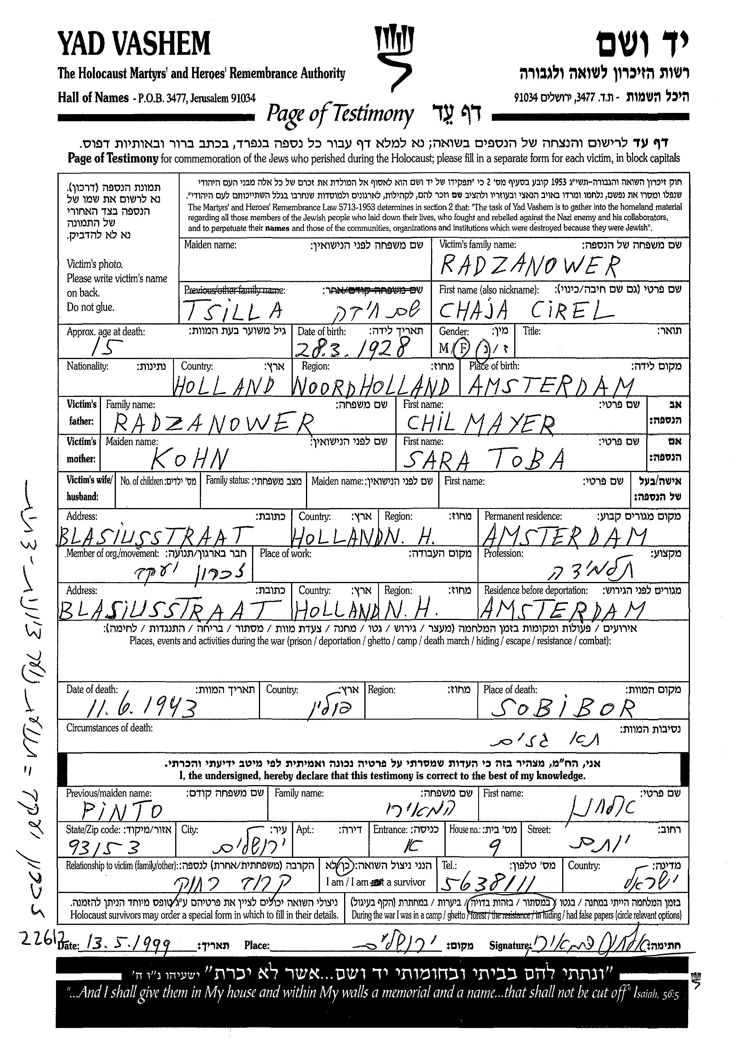 Cirel Tsilla Chaja wurde in der Schoah ermordet. Todesort: Sobibor, Polen im Jahr 11/06/1943.