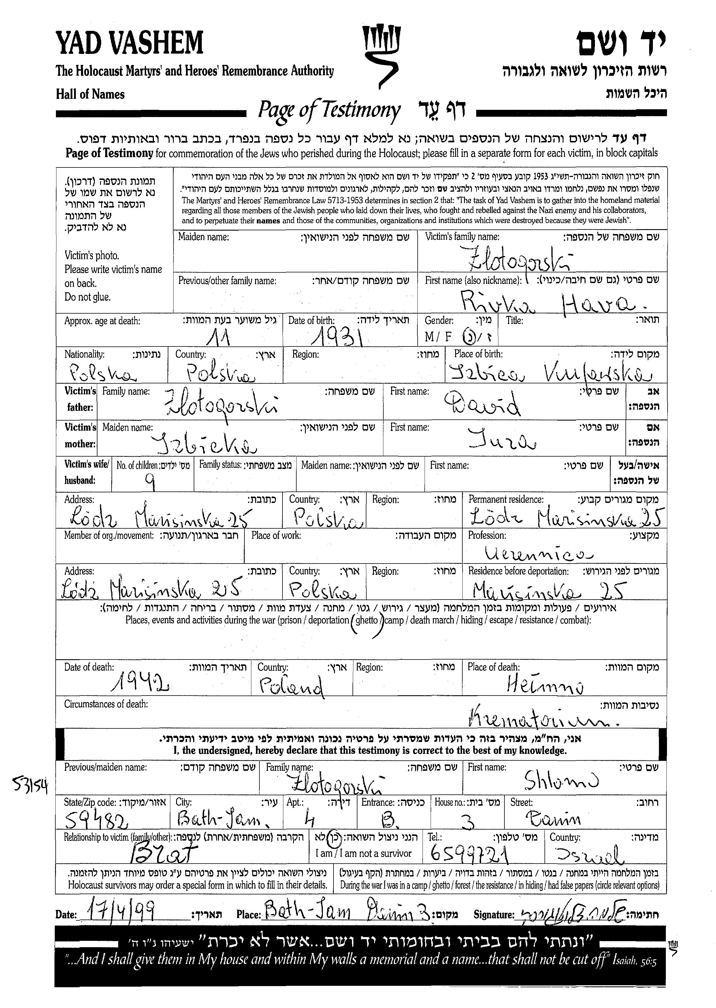 Hava Rivka Zlotogorski wurde im Jahr 1931 in Izbica Kujawska, Polen geboren. Sie war die Tochter von David und Sura, geb. Izbicka. Sie war Schüler/-in und Kind. Vor dem Zweiten Weltkrieg lebte sie in Lodz, Polen. Während des Krieges war sie in Lodz, Polen.