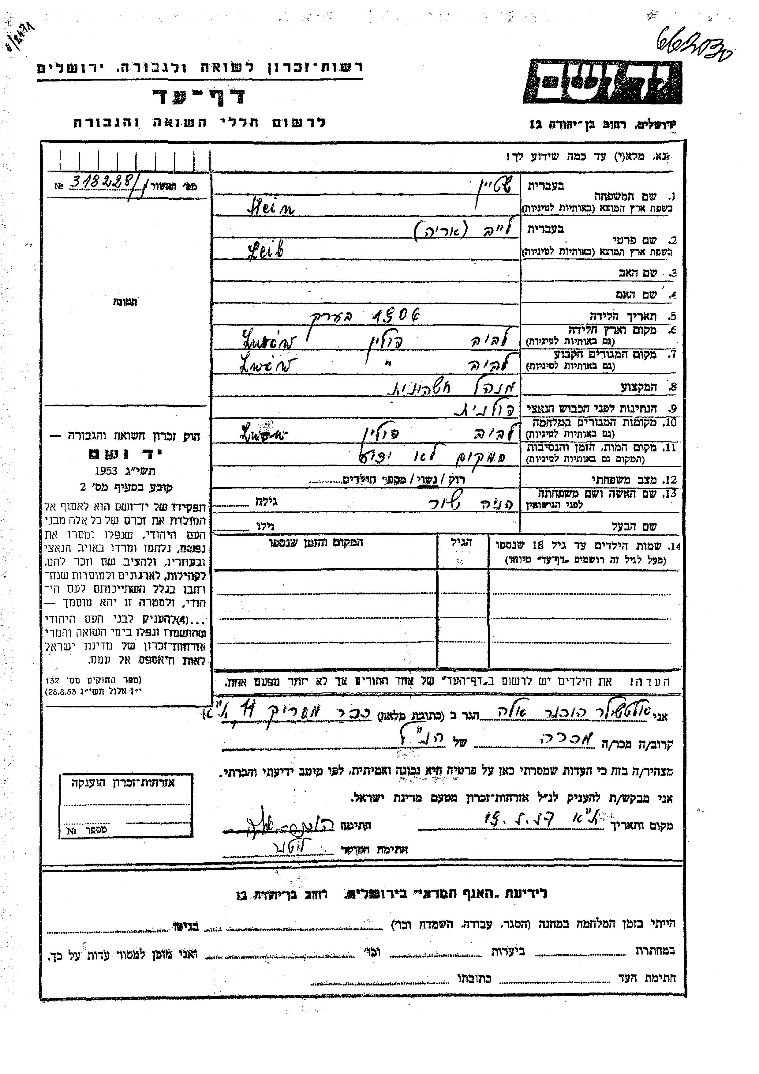 Leib Arie Stein wurde im Jahr 1906 in Lwow, Polen geboren. Er war Buchhalter/-in und mit Henia, geb. Shur Verheiratet. Vor dem Zweiten Weltkrieg lebte er in Lwow, Polen. Während des Krieges war er in Lwow, Polen.