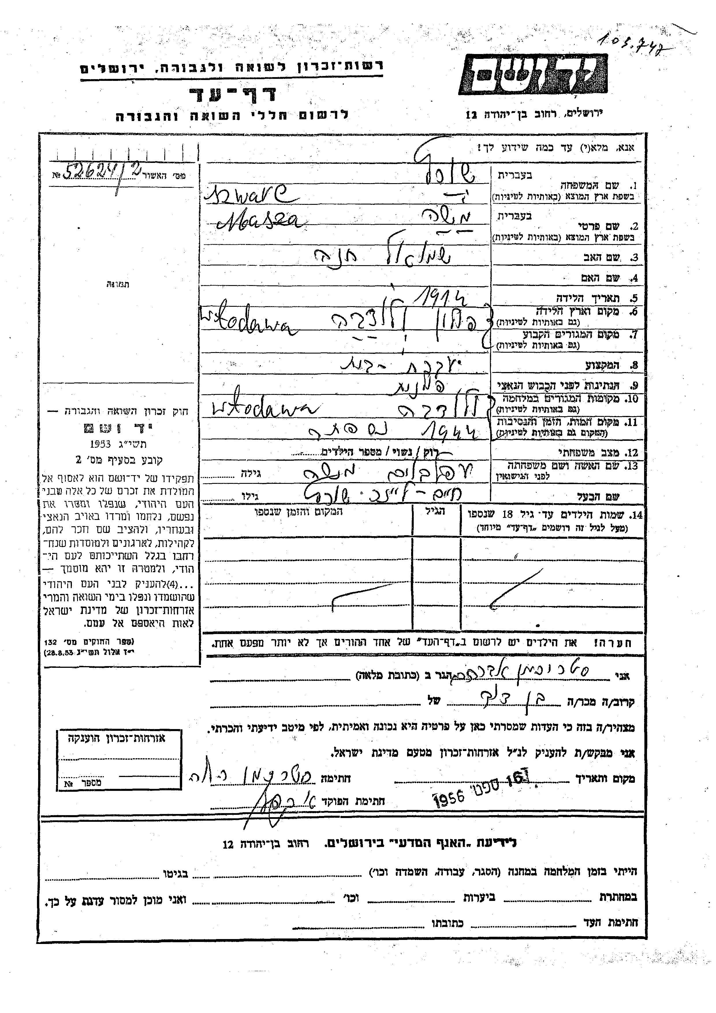Masza Moshe wurde in der Schoah ermordet. Todesort: Wlodawa, Polen im Jahr 1944.