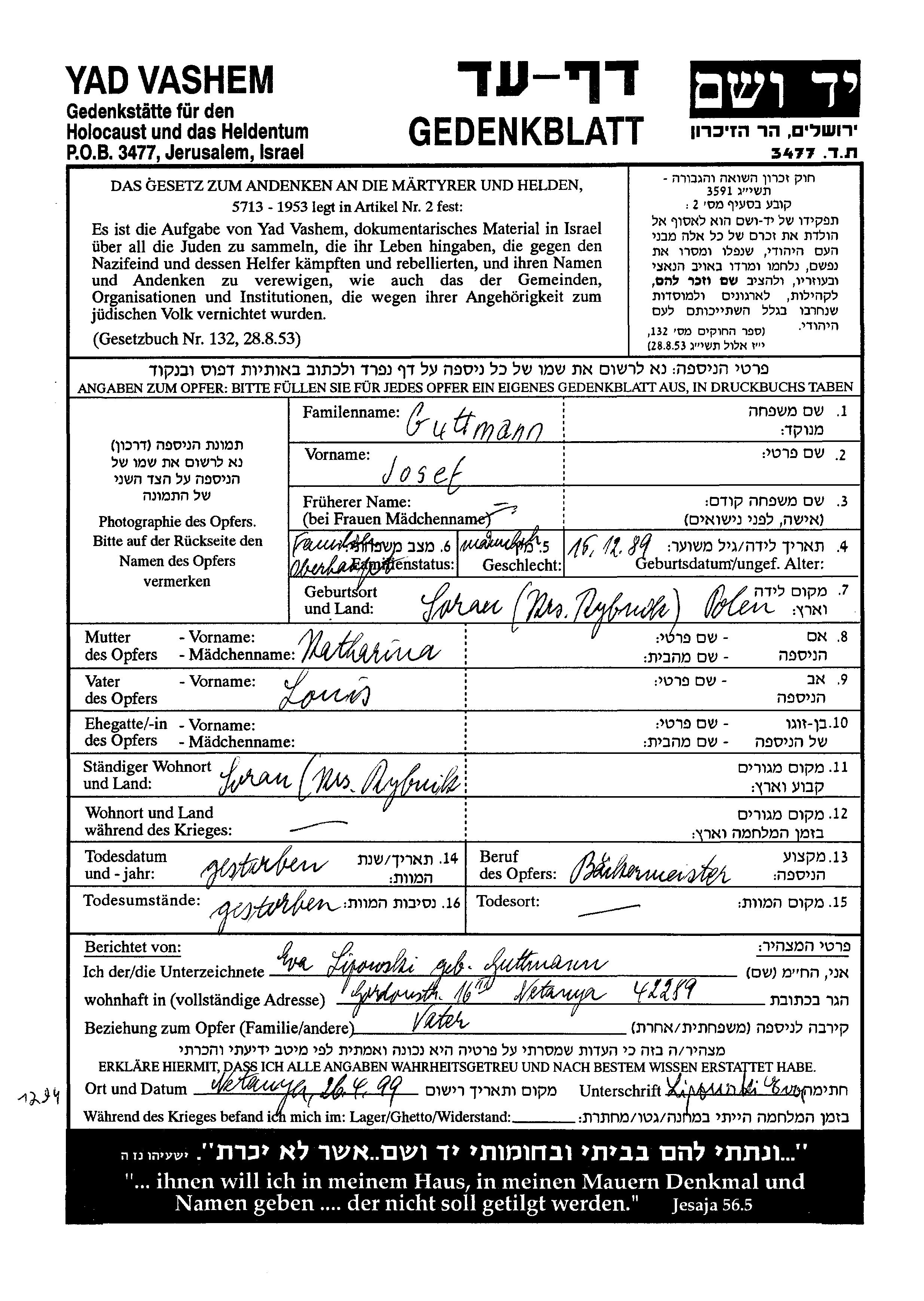 Josef Guttmann wurde im Jahr 1889 in Rybnik, Polen geboren. Er war der Sohn von Louis und Katharina. Er war Baeckermeister. Vor dem Zweiten Weltkrieg lebte er in Rybnik, Polen.