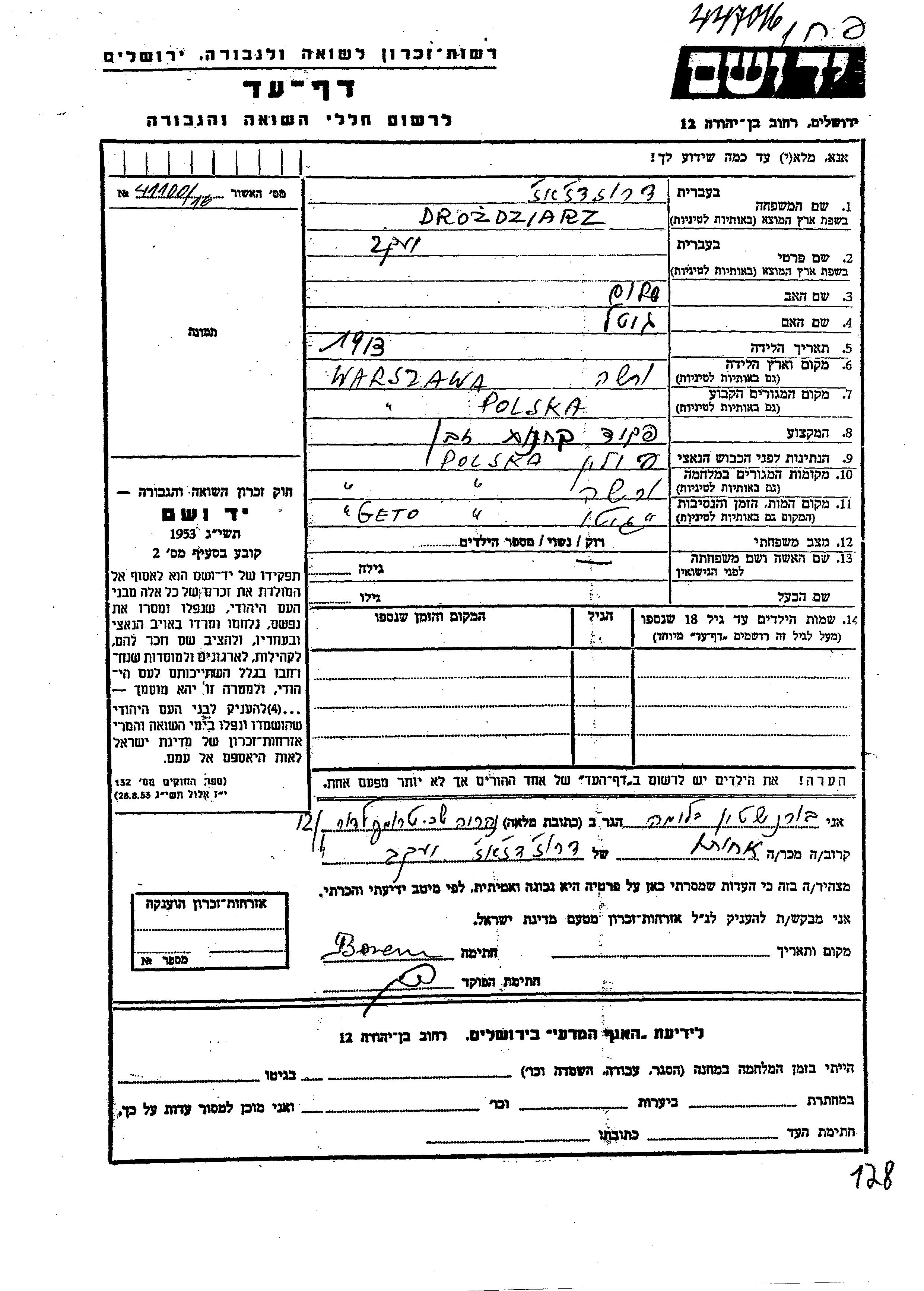 Yaakov Drozdziarz wurde im Jahr 1913 in Warszawa, Polen geboren. Er war der Sohn von Shalom und Gitel. Er war Verkäufer und Ledig. Vor dem Zweiten Weltkrieg lebte er in Warszawa, Polen. Während des Krieges war er in Warszawa, Polen.