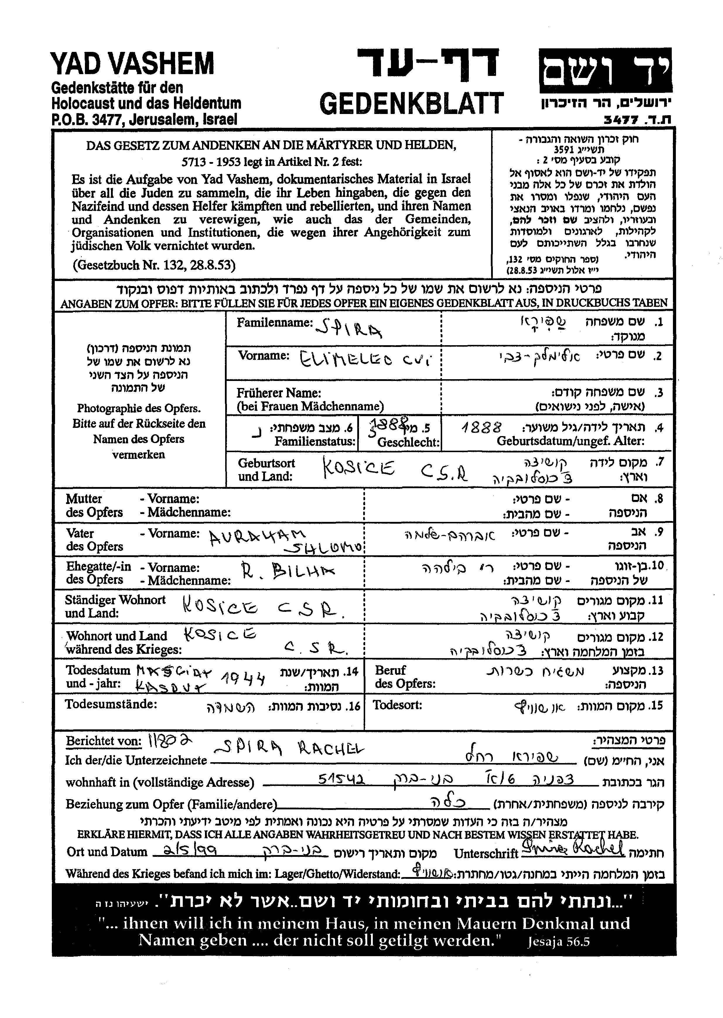 Elimelec Shpira wurde im Jahr 1888 in Kosice, Tschechoslowakei geboren. Er war der Sohn von Shlomo Avraham. Er war Kaschrut-inspektor und mit R Bilha Verheiratet. Vor dem Zweiten Weltkrieg lebte er in Kosice, Tschechoslowakei. Während des Krieges war er in Kosice, Tschechoslowakei.