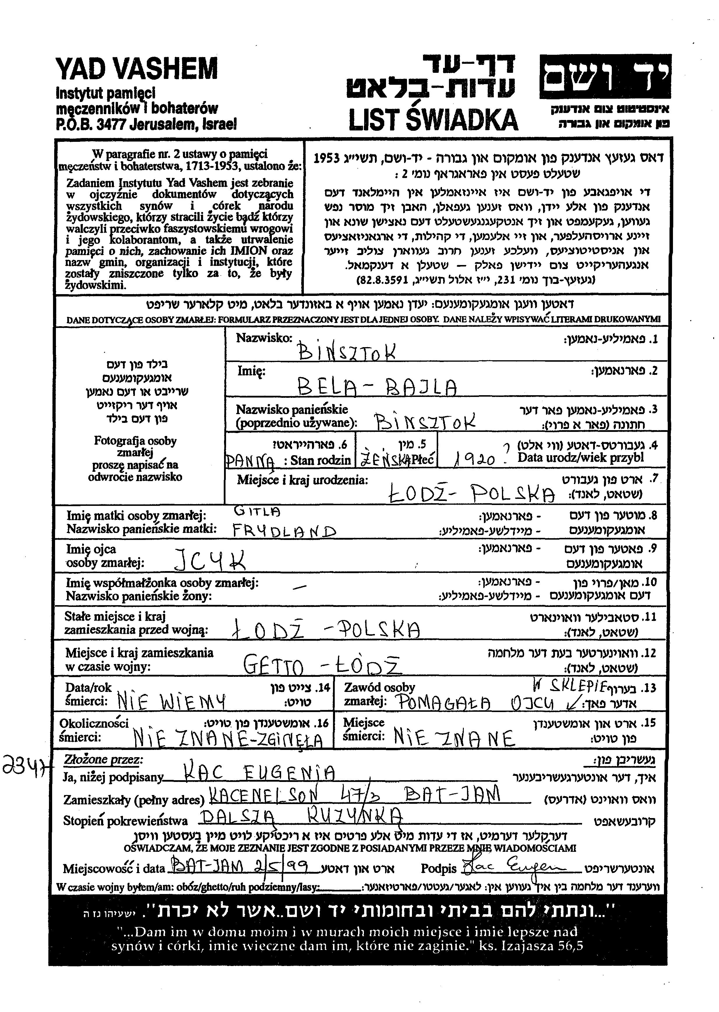 Bajla Binsztok wurde im Jahr 1920 in Lodz, Polen geboren. Sie war die Tochter von Jcyk und Gitla, geb. Frydland. Sie war Ledig. Vor dem Zweiten Weltkrieg lebte sie in Lodz, Polen. Während des Krieges war sie in Lodz, Polen.