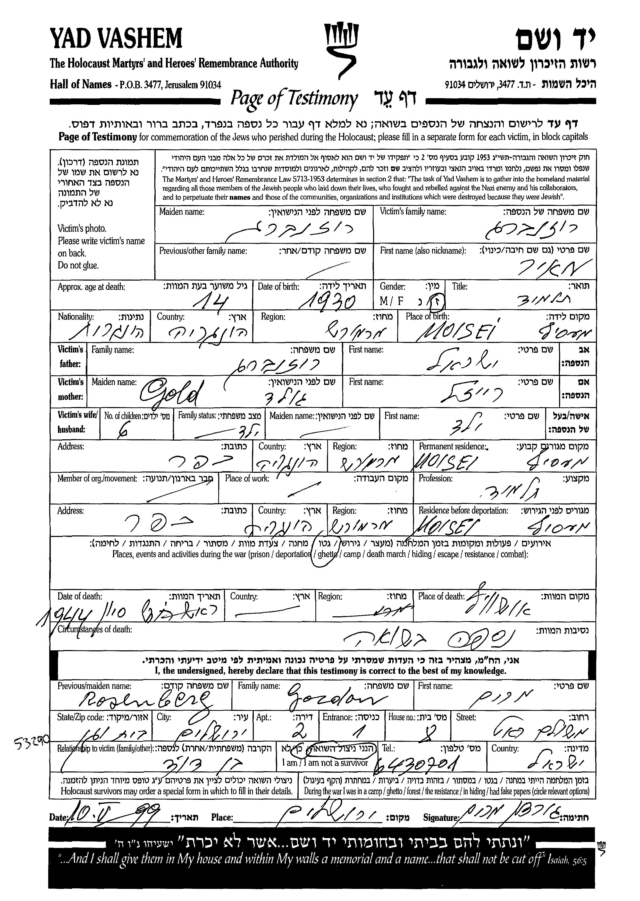Rozenberg Meir 1930 Moisei, Rumänien Gedenkblatt