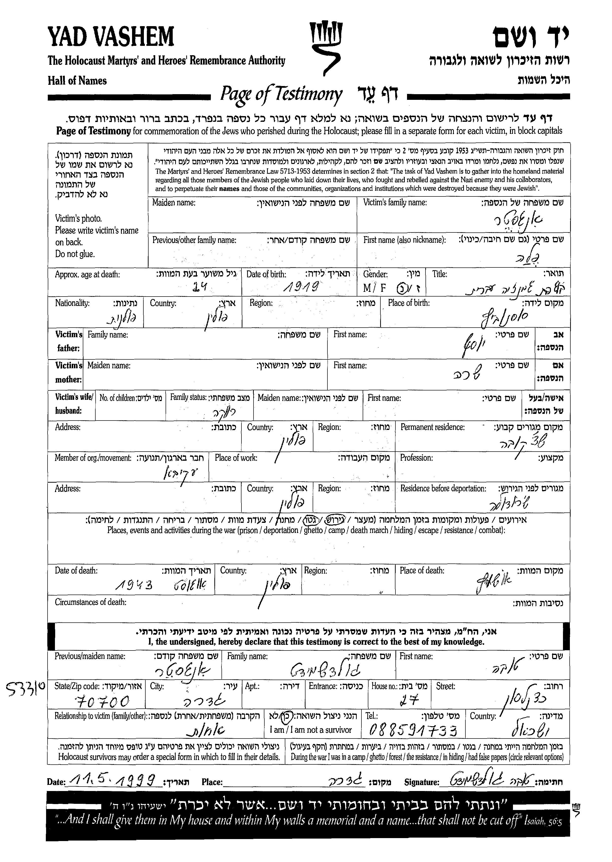 Fela wurde in der Schoah ermordet. Todesort: Auschwitz, Polen im Jahr 08/1943.