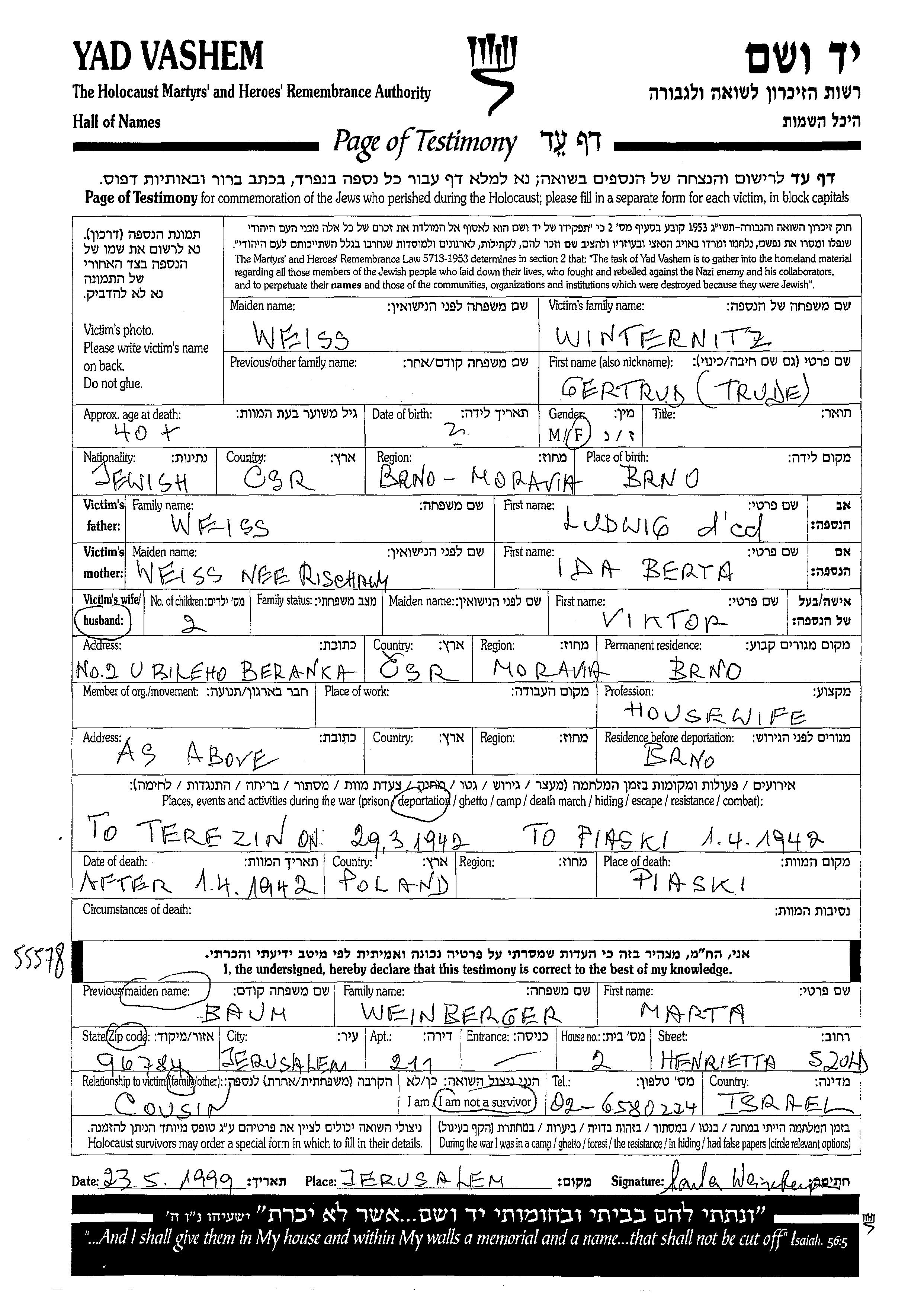 Trude Winternitz, geb. Weiss wurde in Brno, Tschechoslowakei geboren. Sie war die Tochter von Ludwig und Ida Berta, geb. Rischawy. Sie war Hausfrau und mit Viktor Verheiratet. Vor dem Zweiten Weltkrieg lebte sie in Brno, Tschechoslowakei. Während des Krieges war sie in Brno, Tschechoslowakei.