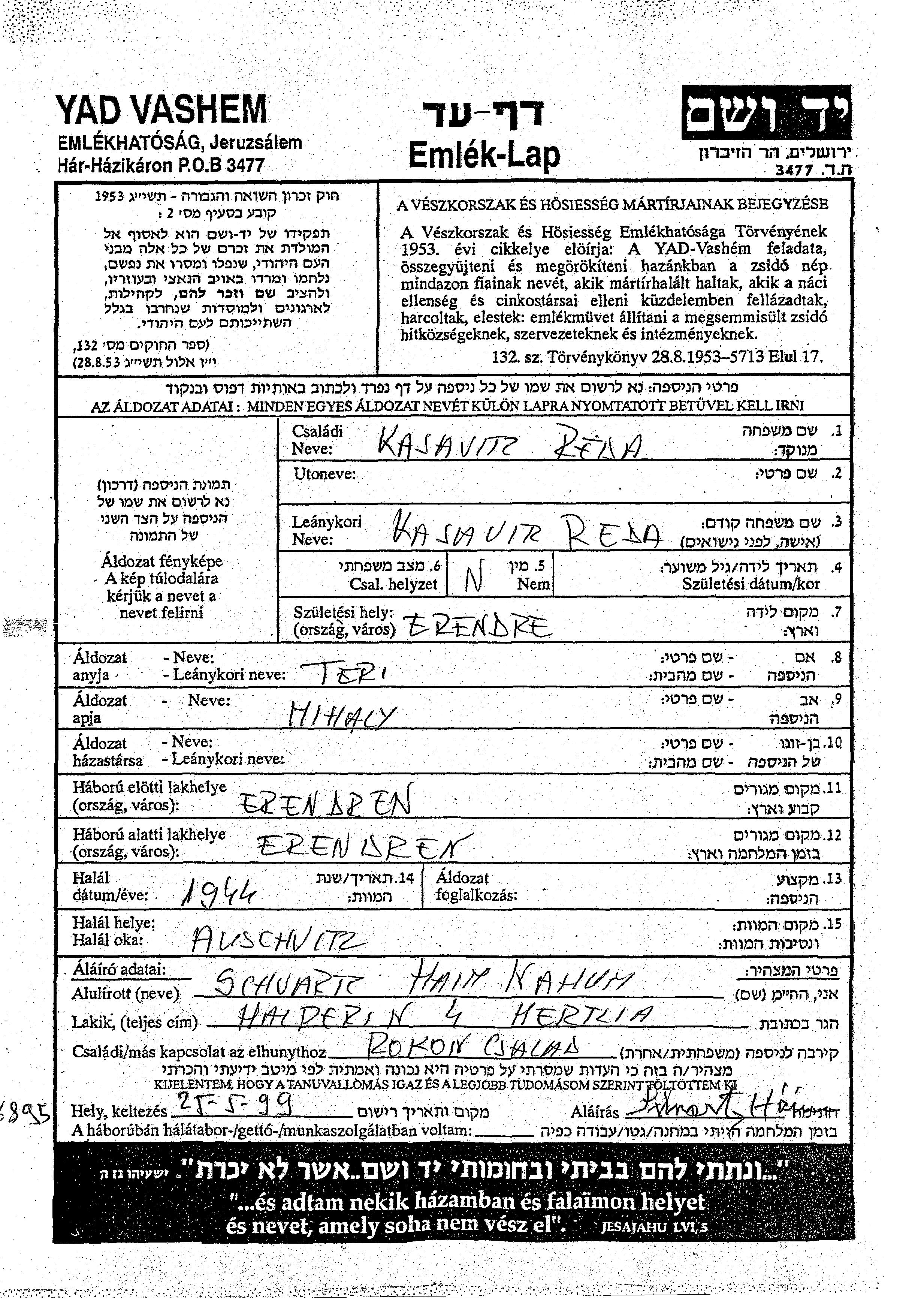 Reda Kasavitz wurde in Erendred, Rumänien geboren. Sie war die Tochter von Mihaly und Teri. Vor dem Zweiten Weltkrieg lebte sie in Erendred, Rumänien. Während des Krieges war sie in Erendred, Rumänien.