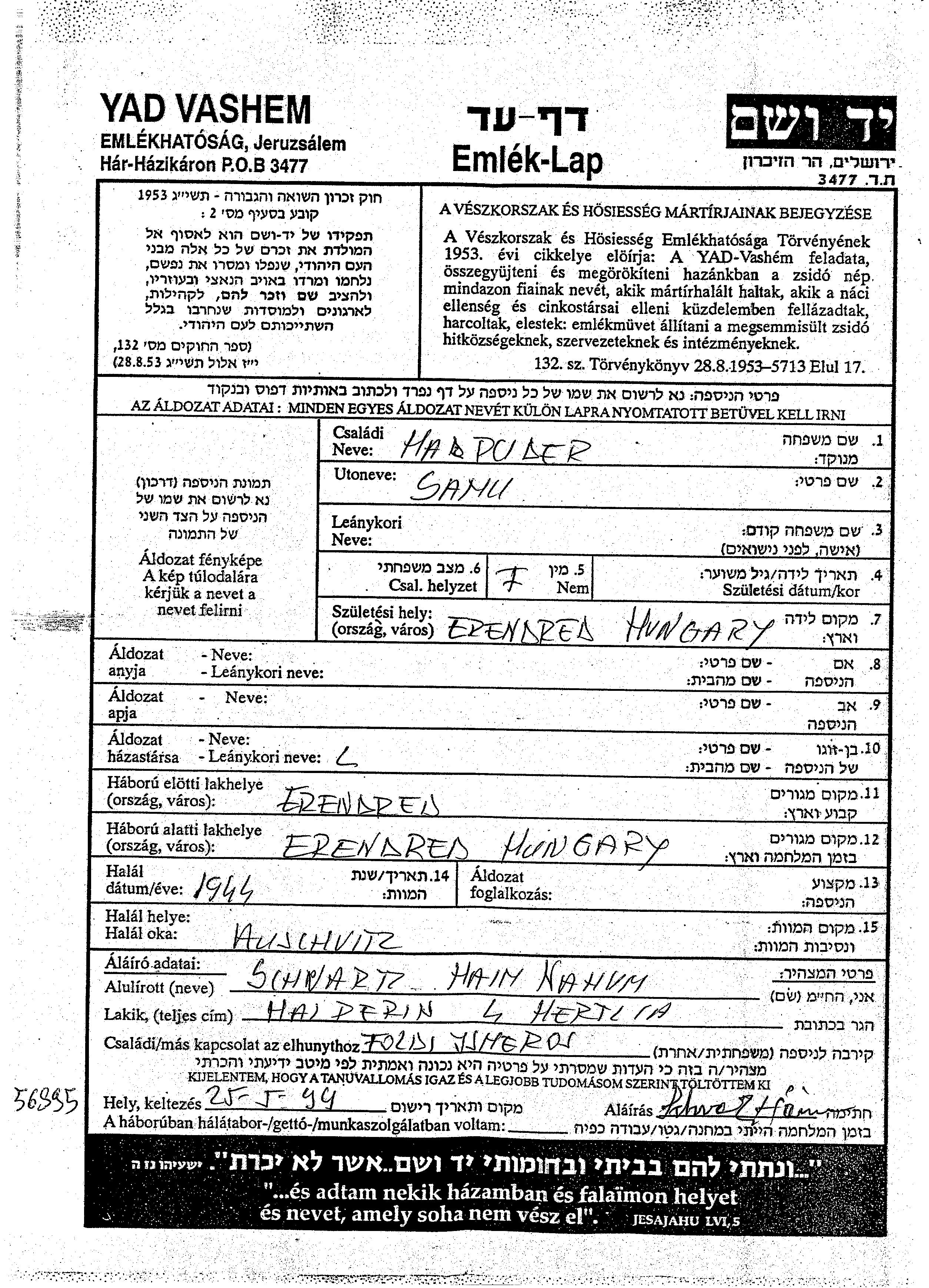 Samu Harpuder wurde in Erendred, Rumänien geboren. Vor dem Zweiten Weltkrieg lebte er in Erendred, Rumänien. Während des Krieges war er in Erendred, Rumänien.