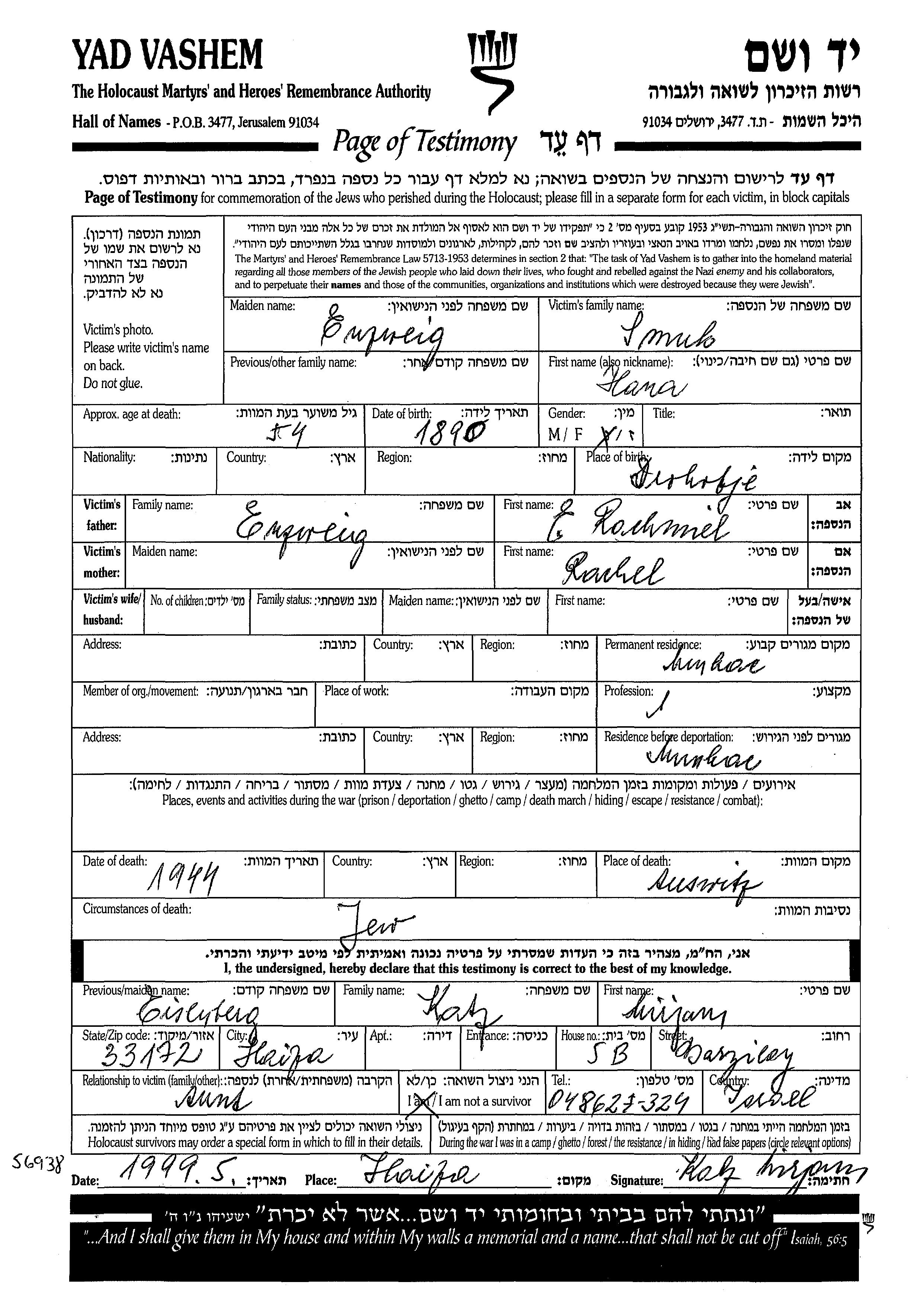 Hana Smuk, geb. Eisenberg wurde im Jahr 1890 in Drohobratove, Tschechoslowakei geboren. Sie war die Tochter von Rachmiel und Rachel. Vor dem Zweiten Weltkrieg lebte sie in Mukacevo, Tschechoslowakei. Während des Krieges war sie in Mukacevo, Tschechoslowakei.