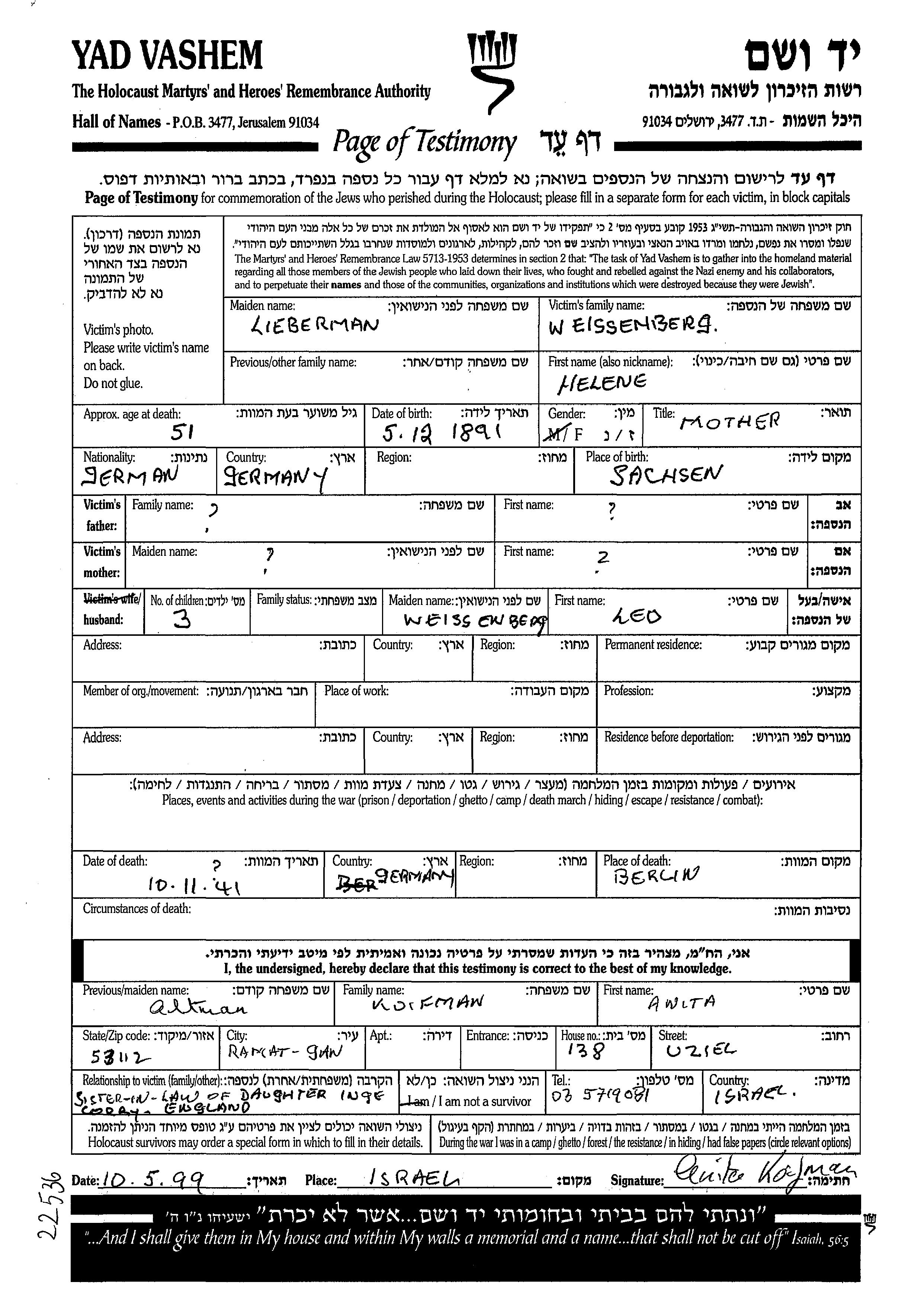 Helene wurde in der Schoah ermordet. Todesort: Berlin, Deutsches Reich im Jahr 10/11/1941.