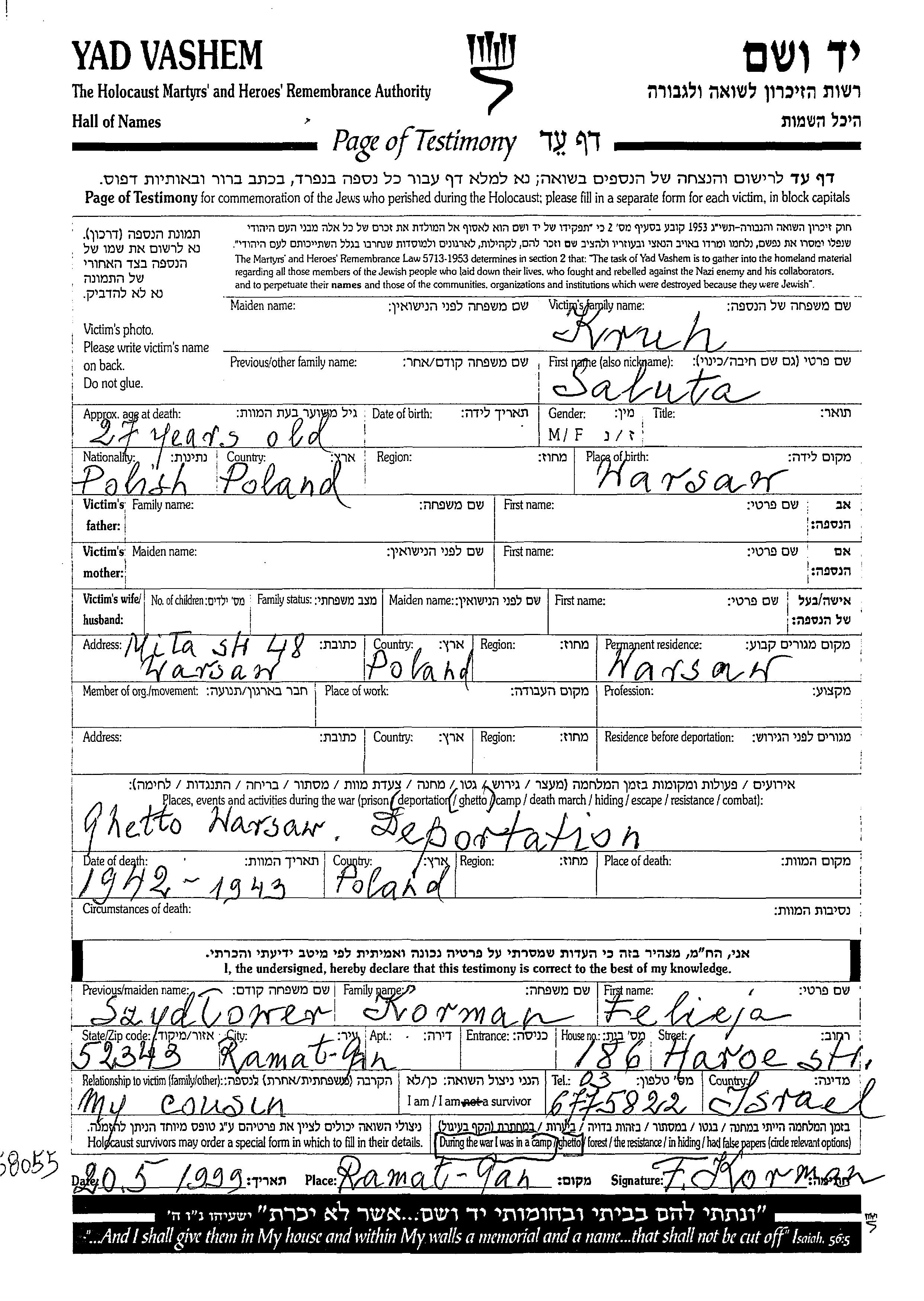 Saluta wurde in der Schoah ermordet. Todesort: Lager, Polen im Jahr 1942.