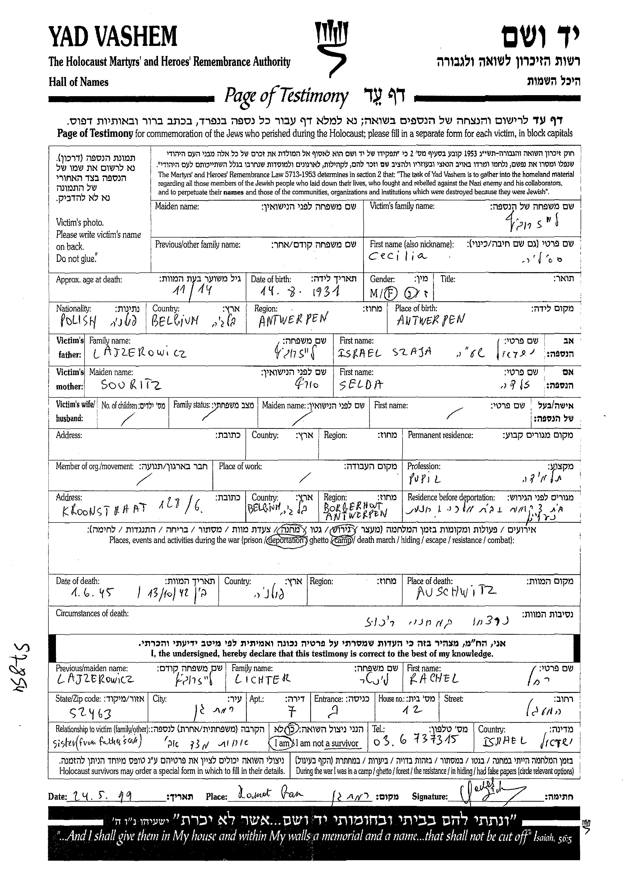 Cecilia Leizerovitz wurde im Jahr 1931 in Antwerpen, Belgien geboren. Sie war die Tochter von Yisrael Szaja und Zelda, geb. Souritz. Sie war Schüler/-in. Während des Krieges war sie in Antwerpen, Belgien.