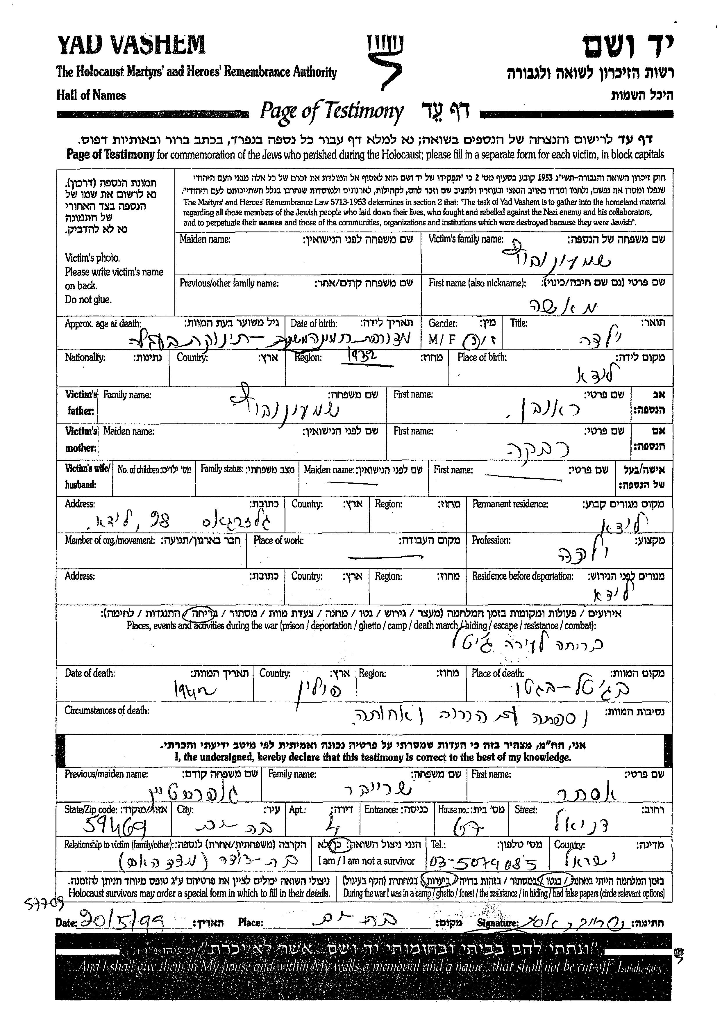 Shemonovitz Masha Lida, Polen Gedenkblatt