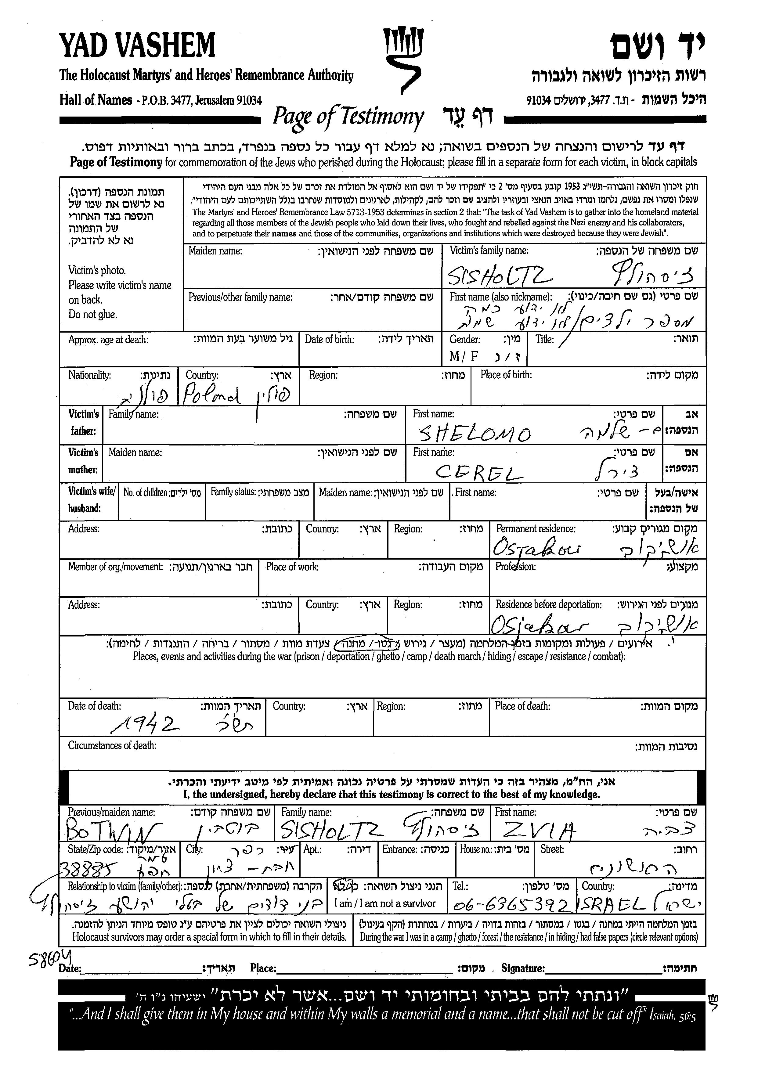 Vorname unbekannt Sisholtz wurde in Polen geboren. Er/sie war der/ die Sohn/Tochter von Shlomo und Cerel. Vor dem Zweiten Weltkrieg er/sie in Osjakow, Polen. Während des Krieges war er/sie in Osjakow, Polen.