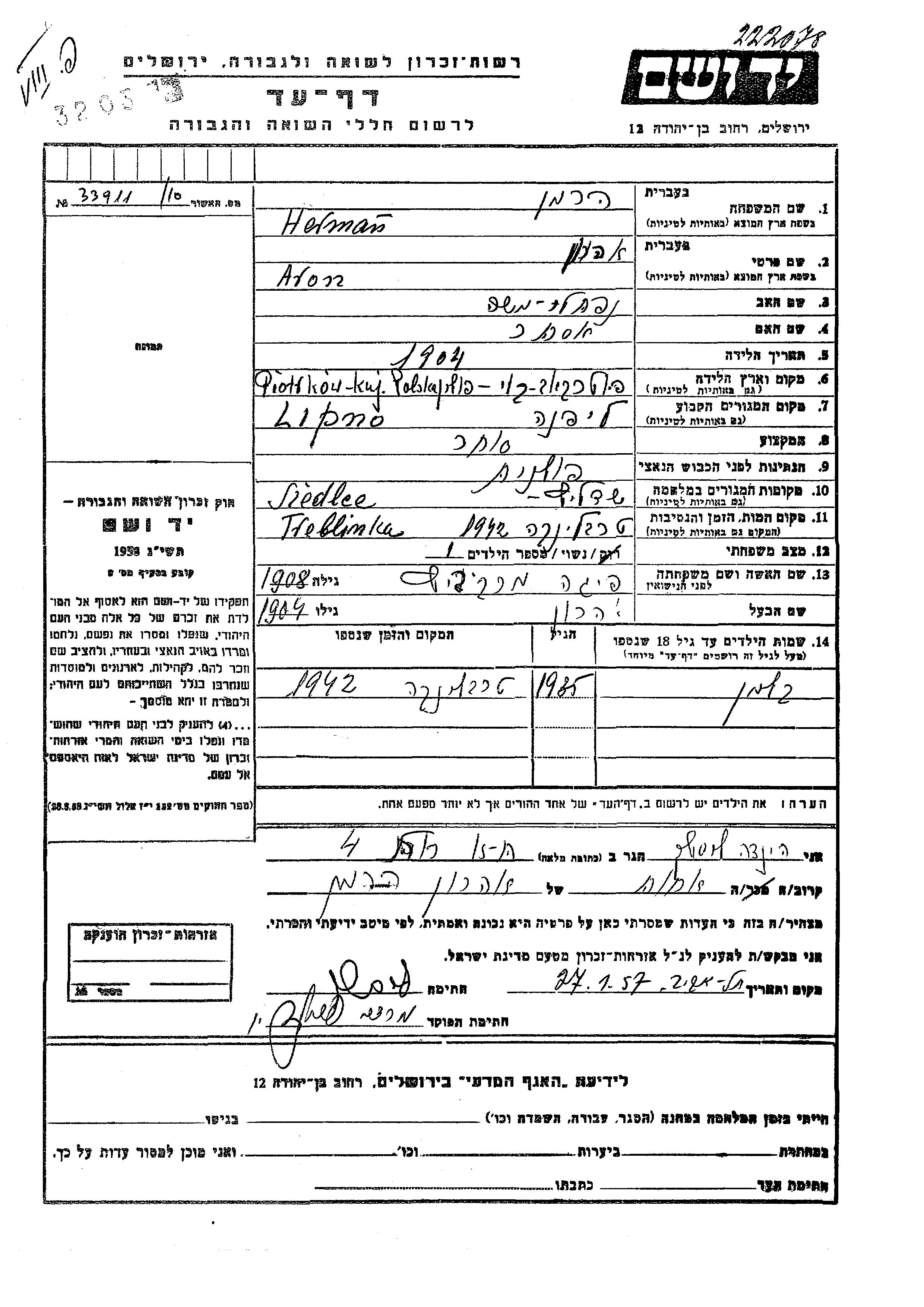 Aron Herman wurde im Jahr 1904 in Piotrkow Kujawski, Polen geboren. Er war der Sohn von Naftali Moshe und Ester. Er war Kaufmann/-frau und mit Feiga, geb. Markevitz Verheiratet. Vor dem Zweiten Weltkrieg lebte er in Lipno, Polen. Während des Krieges war er in Siedlce, Polen.