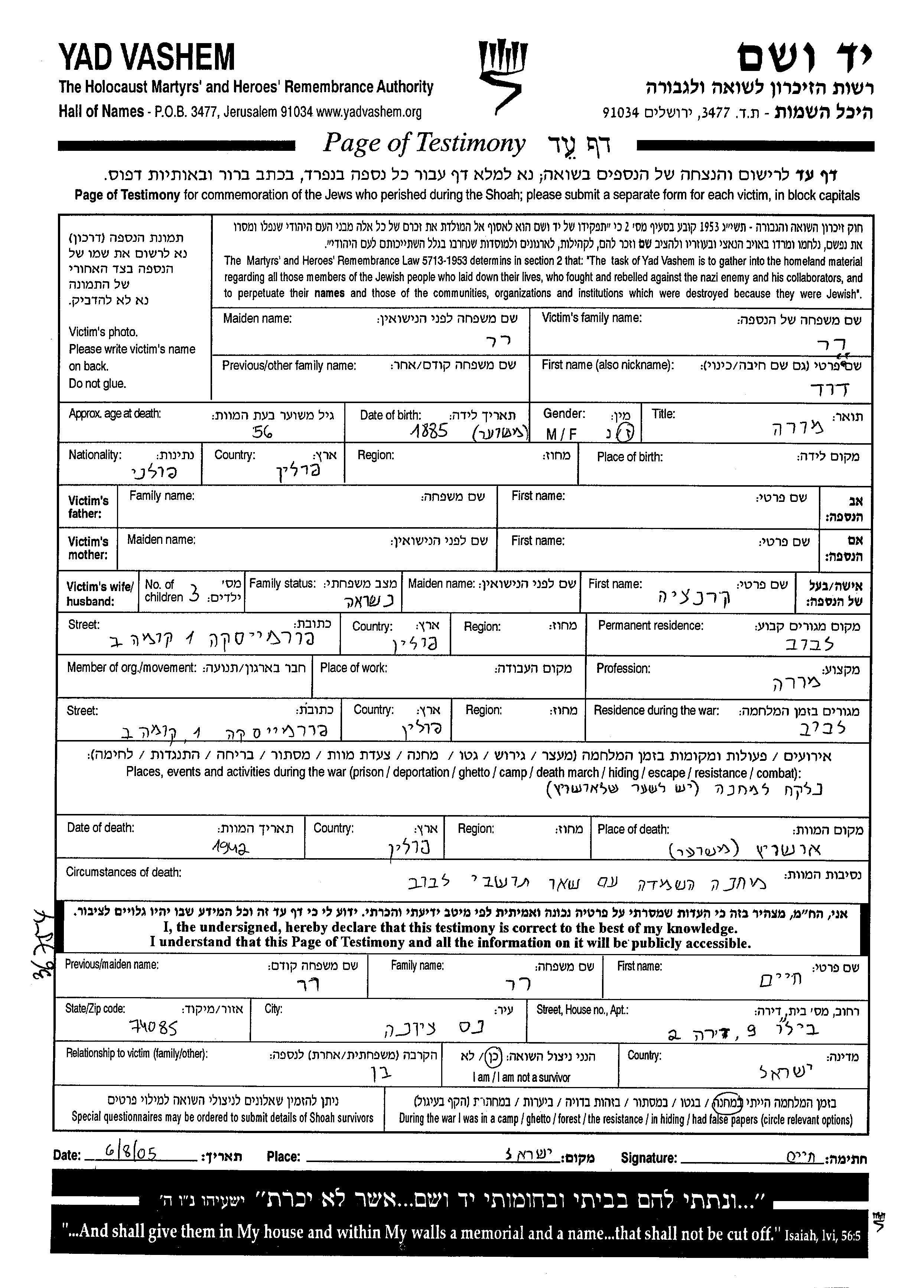 David Rer wurde im Jahr 1885 geboren. Er war mit Kreina Verheiratet. Vor dem Zweiten Weltkrieg lebte er in Lwow, Polen. Während des Krieges war er in Lwow, Polen.