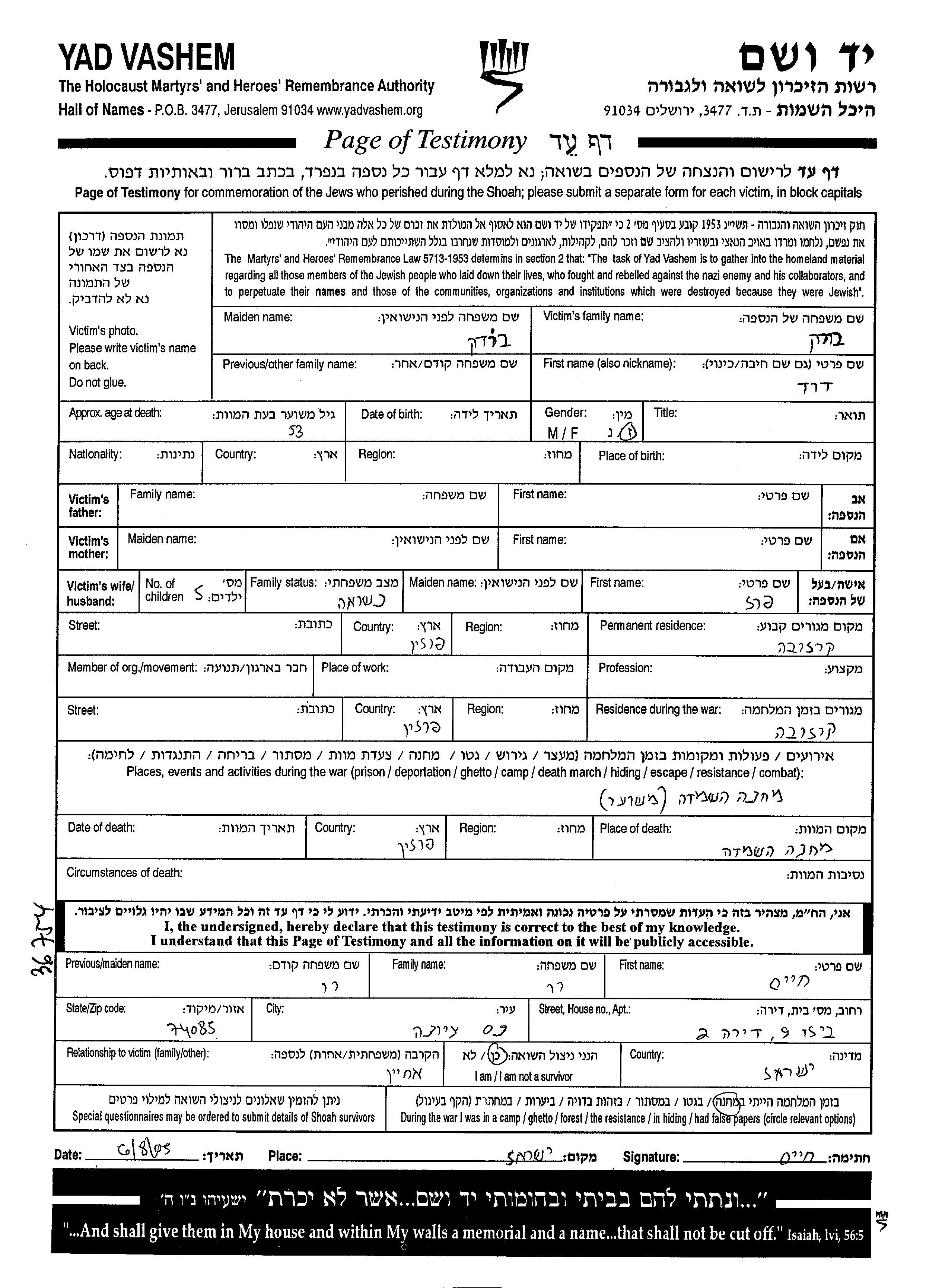 David Bodek. Er war mit Perel Verheiratet. Vor dem Zweiten Weltkrieg lebte er in Krzywe, Polen. Während des Krieges war er in Krzywe, Polen.