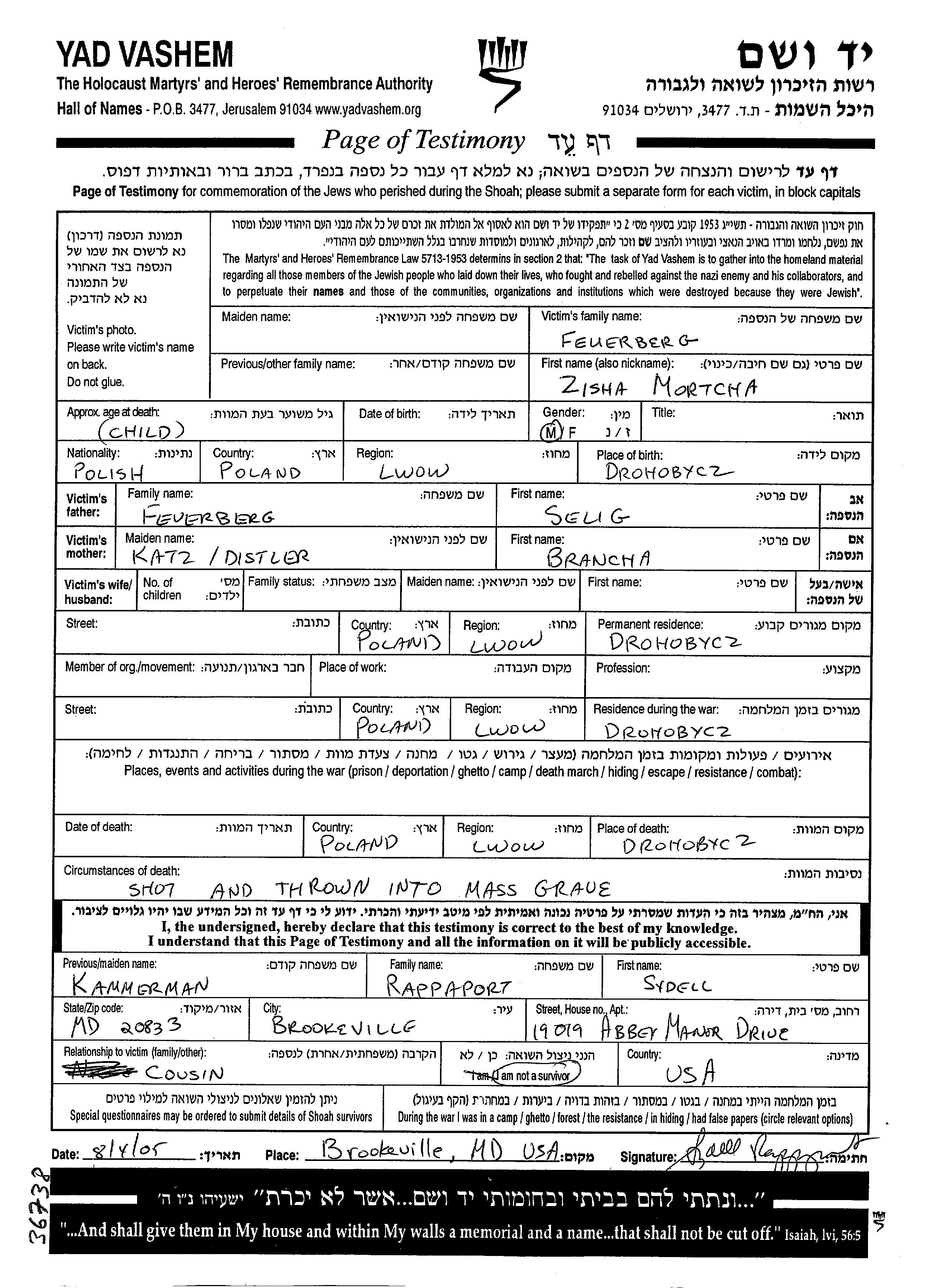 Mortcha Zisha Feuerberg wurde in Drohobycz, Polen geboren. Er war der Sohn von Selig und Brancha, geb. Distler Katz. Er war Kind. Vor dem Zweiten Weltkrieg lebte er in Drohobycz, Polen. Während des Krieges war er in Drohobycz, Polen.