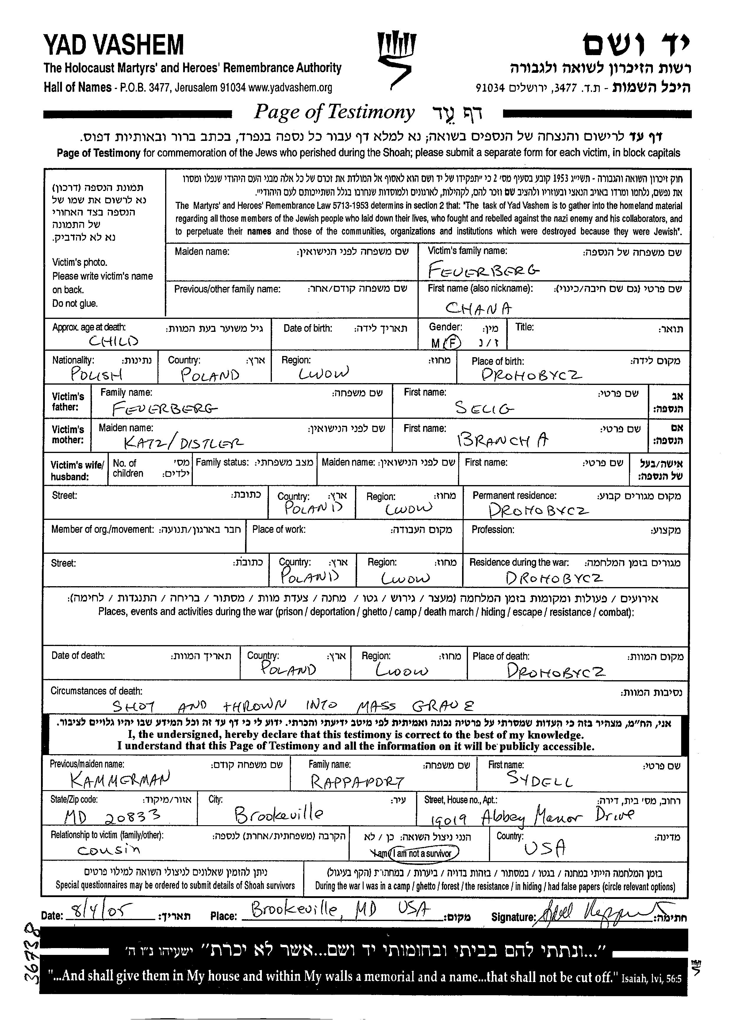 Chana wurde in der Schoah ermordet. Todesort: Drohobycz, Polen.