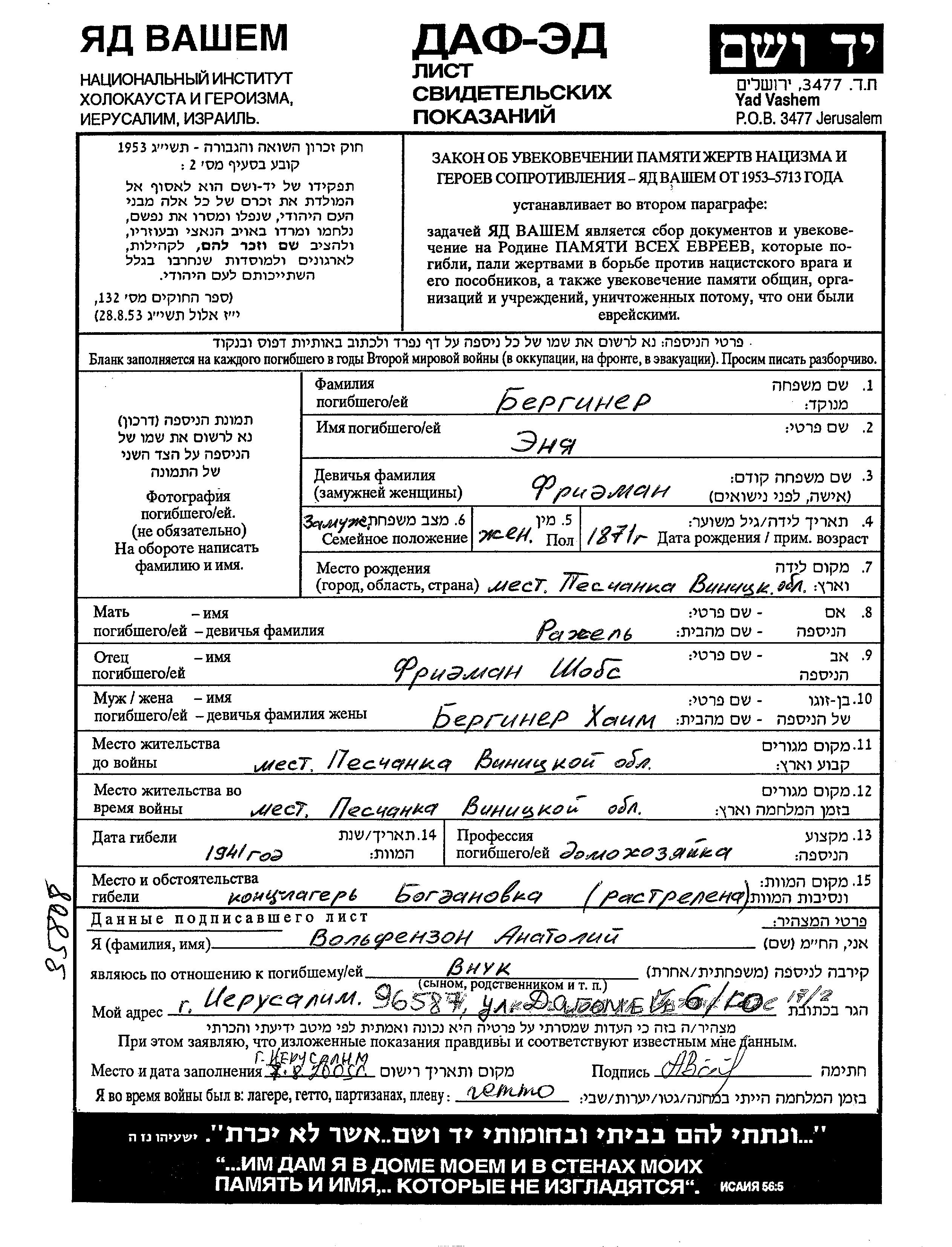 Enya Berginer, geb. Fridman wurde im Jahr 1871 in Peschanka, Ukraine (UdSSR) geboren. Sie war die Tochter von Shobs und Rakhel. Sie war Hausfrau und mit Khaim Verheiratet. Vor dem Zweiten Weltkrieg lebte sie in Peschanka, Ukraine (UdSSR). Während des Krieges war sie in Peschanka, Ukraine (UdSSR).