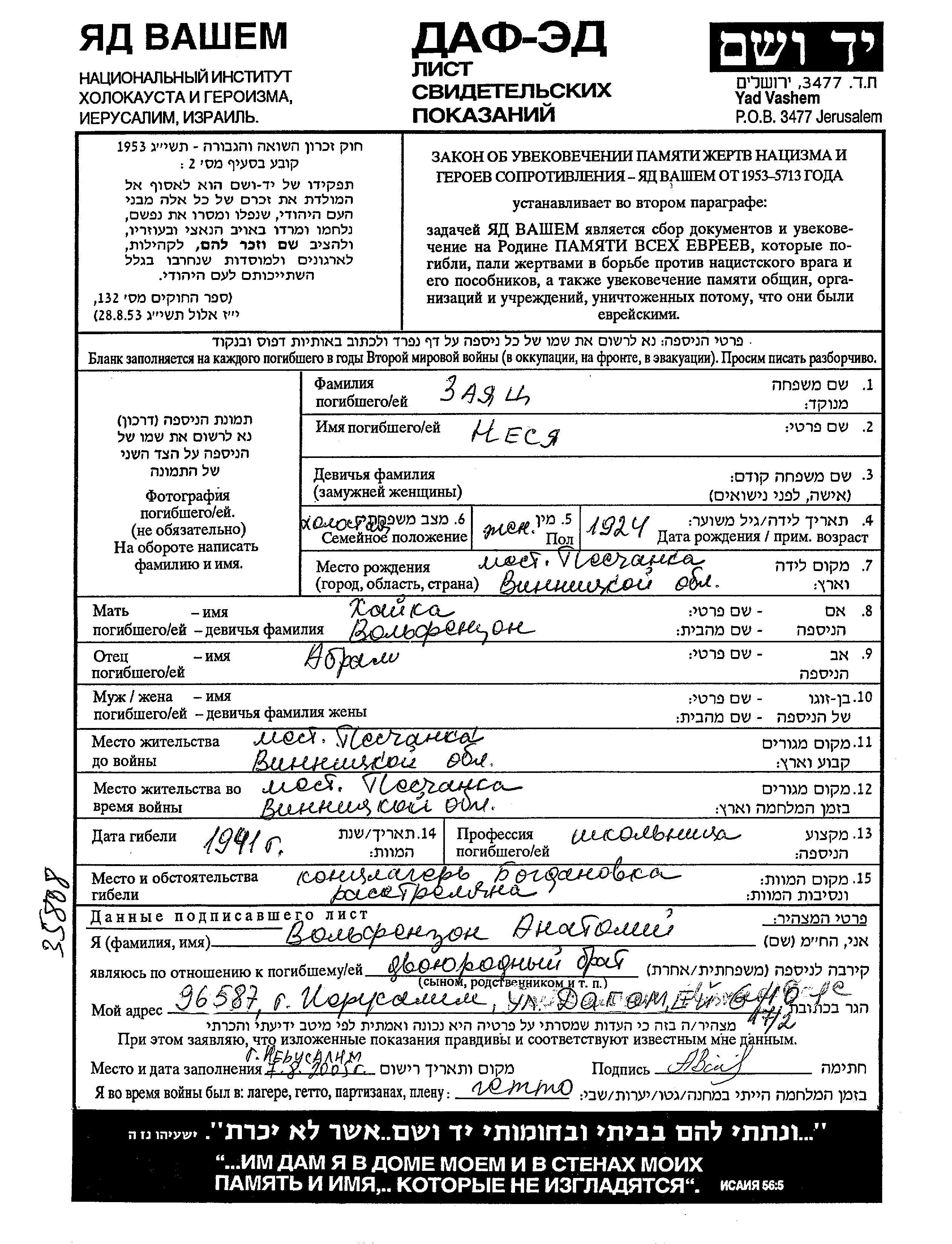 Nesya Zayatz wurde im Jahr 1924 in Peschanka, Ukraine (UdSSR) geboren. Sie war die Tochter von Abram und Khaika, geb. Volfenzon. Sie war Schulmädchen und Ledig. Vor dem Zweiten Weltkrieg lebte sie in Peschanka, Ukraine (UdSSR). Während des Krieges war sie in Peschanka, Ukraine (UdSSR).