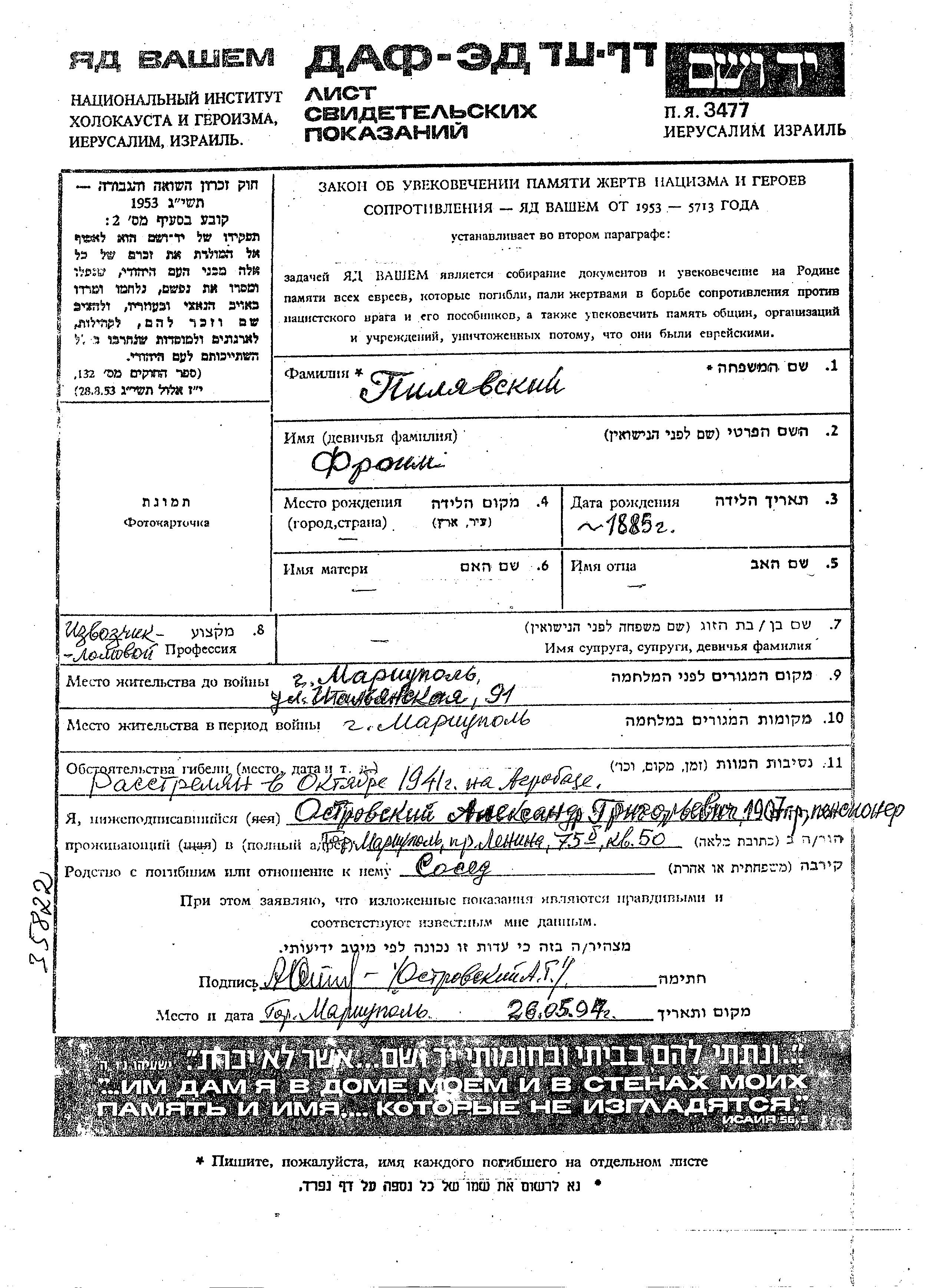 Froim Pilyavski wurde im Jahr 1885 geboren. Er war Fuhrmann. Vor dem Zweiten Weltkrieg lebte er in Mariupol, Ukraine (UdSSR). Während des Krieges war er in Mariupol, Ukraine (UdSSR).
