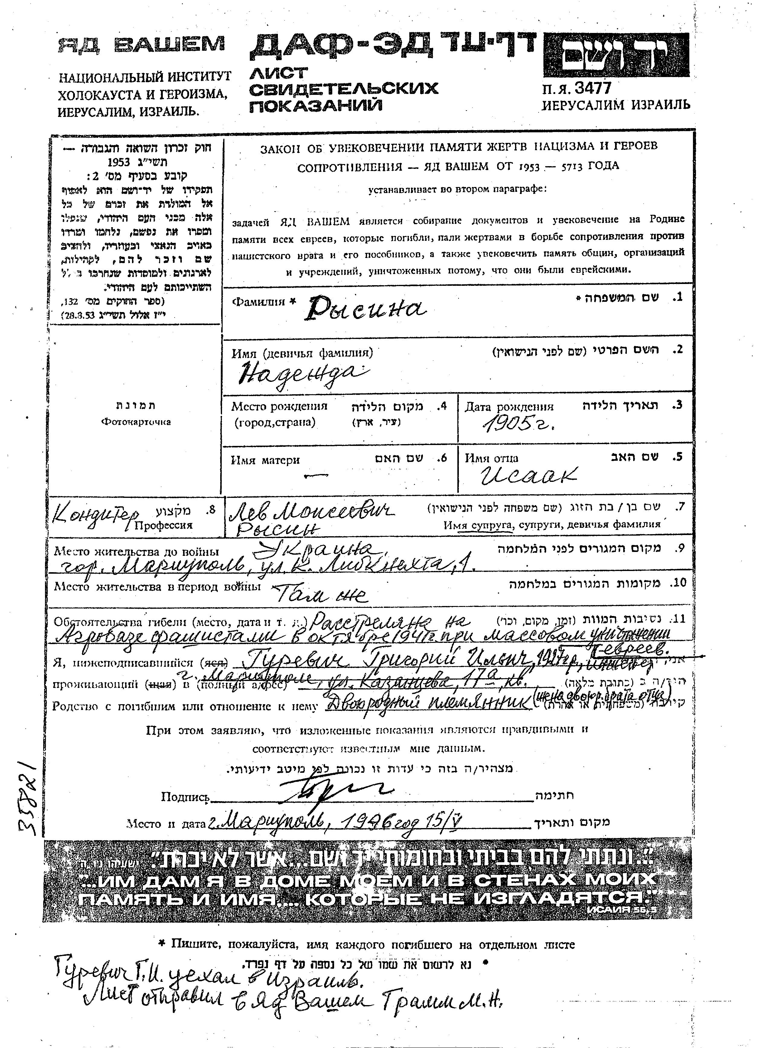 Nadezhda Rysina wurde im Jahr 1905 geboren. Sie war die Tochter von Isaak. Sie war Konditor und mit Lev Verheiratet. Vor dem Zweiten Weltkrieg lebte sie in Mariupol, Ukraine (UdSSR). Während des Krieges war sie in Mariupol, Ukraine (UdSSR).