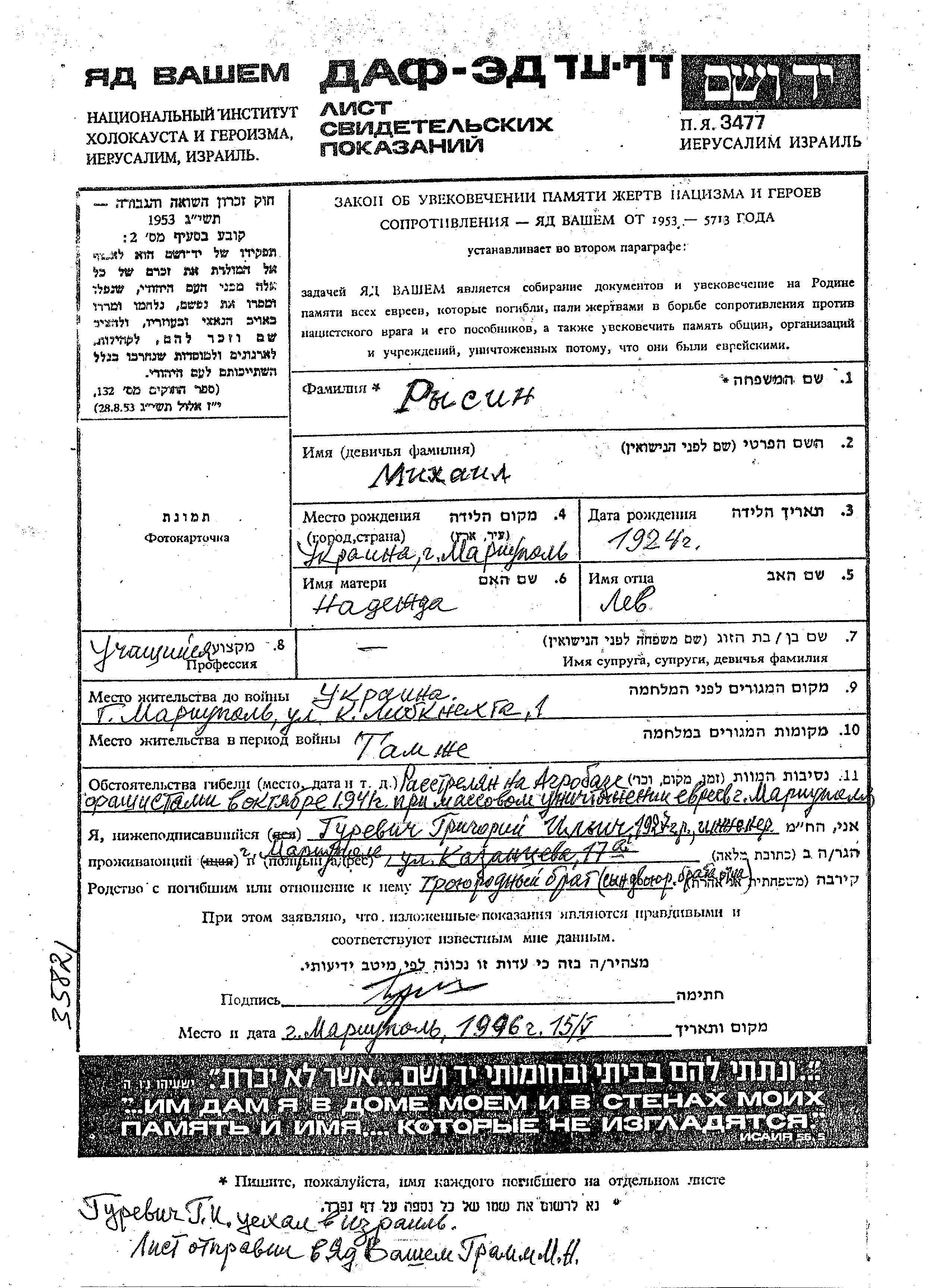 Rysin Mikhail 1924 Mariupol, Ukraine (UdSSR) Gedenkblatt