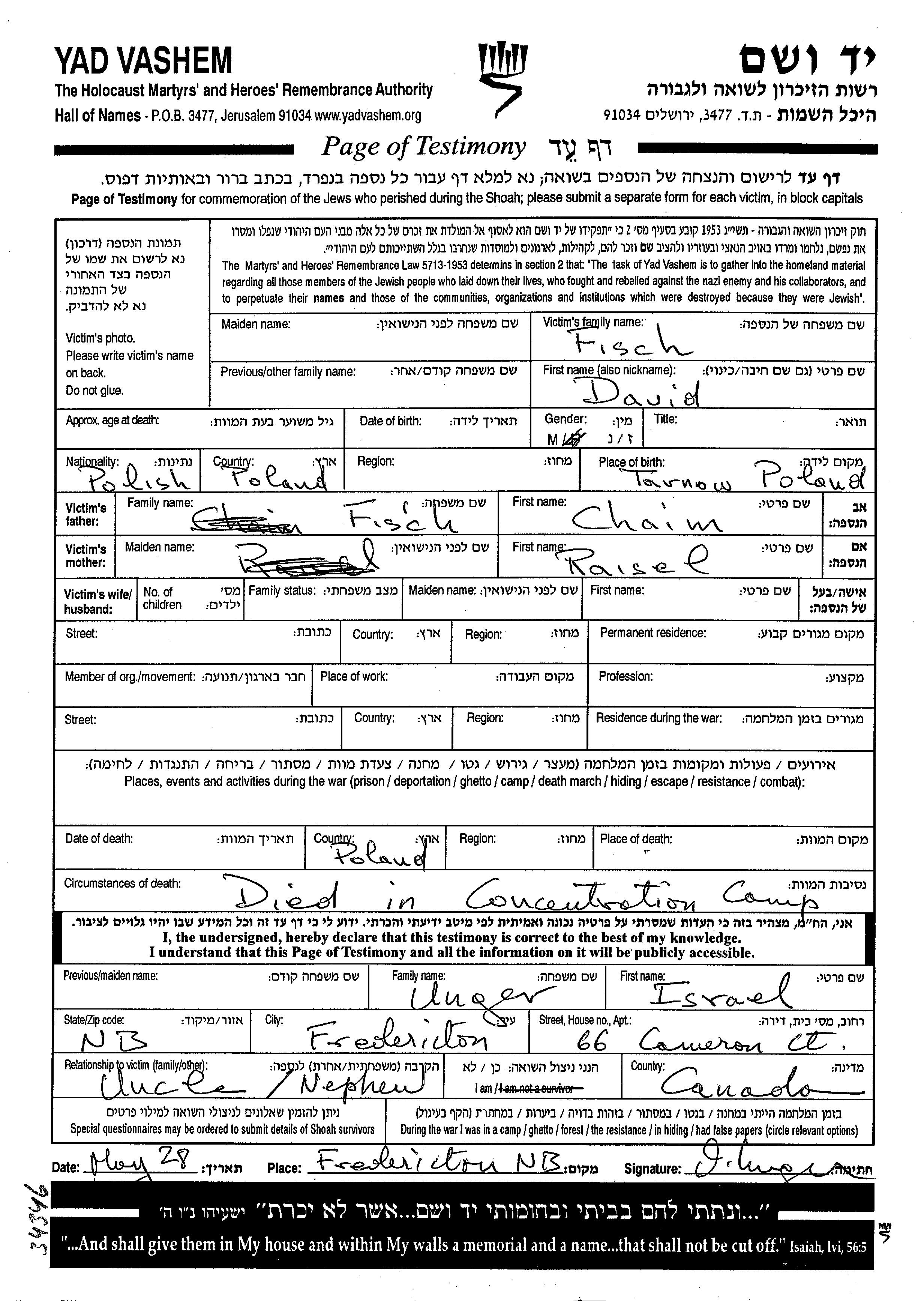 David Fisch wurde in Tarnow, Polen geboren. Er war der Sohn von Chaim und Raisel.