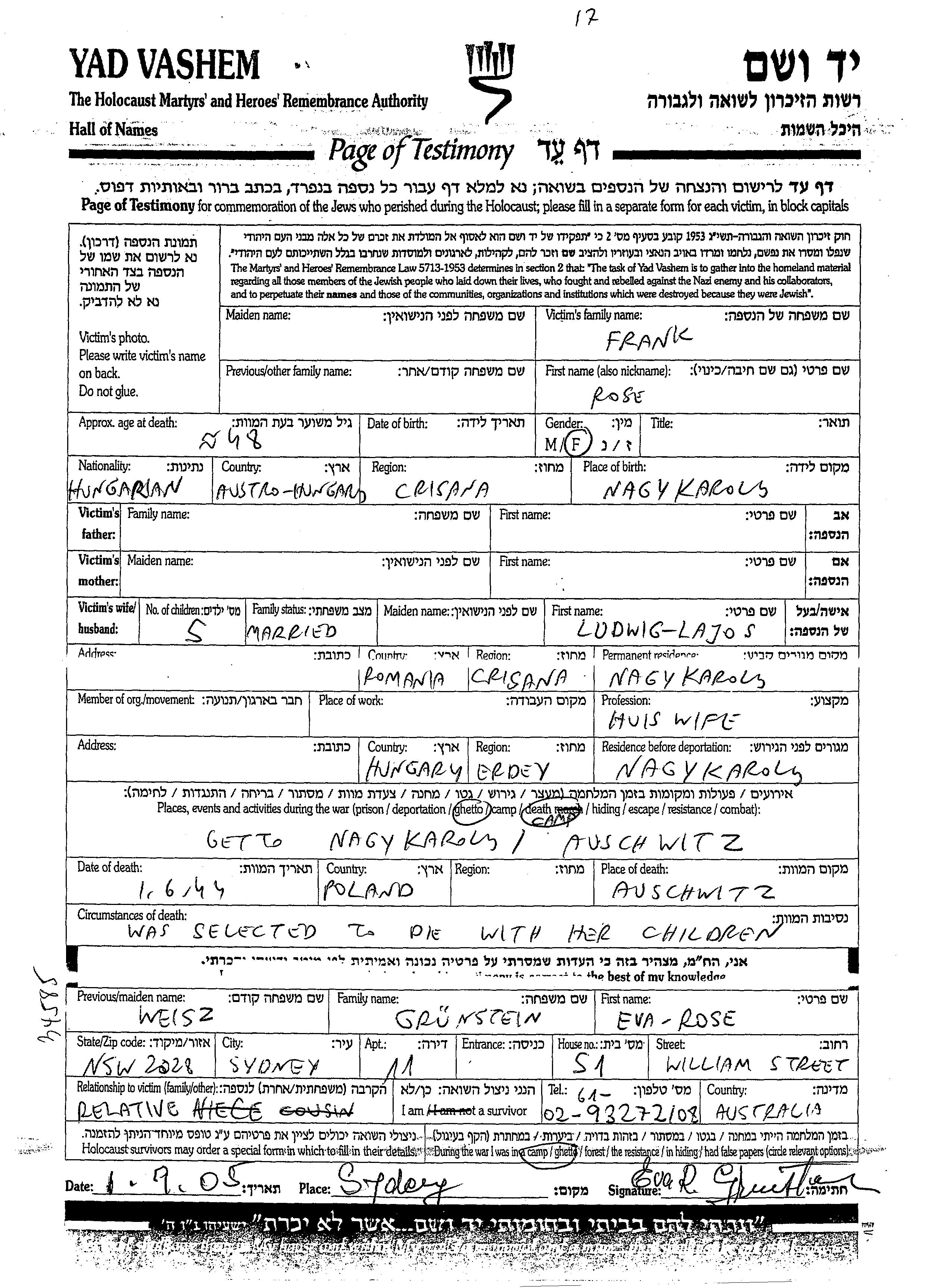 Rose Frank wurde in Nagy Karoly, Rumänien geboren. Sie war Hausfrau und mit Ludwig Lajos Verheiratet. Vor dem Zweiten Weltkrieg lebte sie in Nagy Karoly, Rumänien. Während des Krieges war sie in Getto.