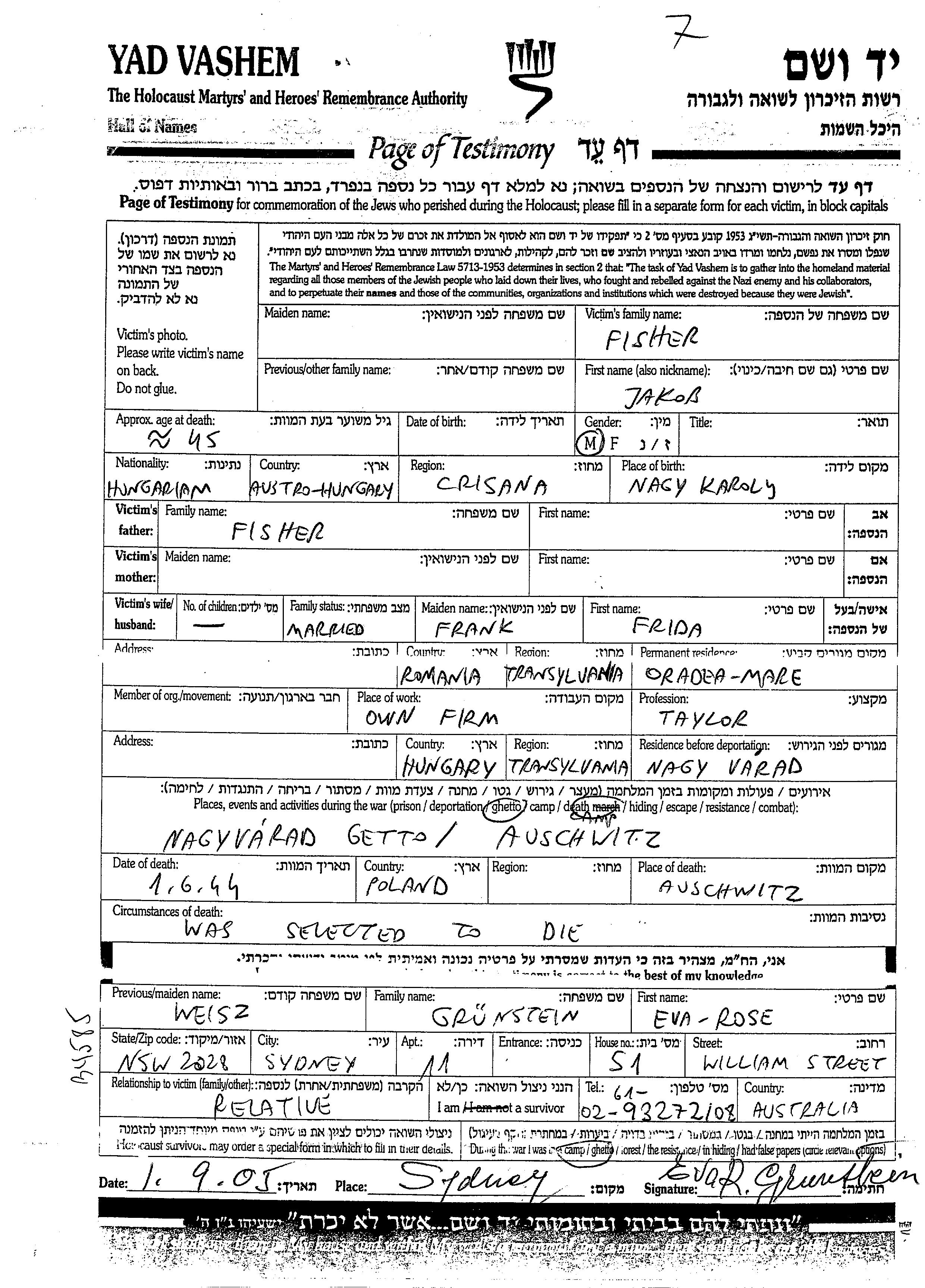 Jakob Fisher wurde in Nagykaroly, Rumänien geboren. Er war Taylor und mit Frida, geb. Frank Verheiratet. Vor dem Zweiten Weltkrieg lebte er in Oradea Mare, Rumänien. Während des Krieges war er in Nagyvarad, Rumänien.