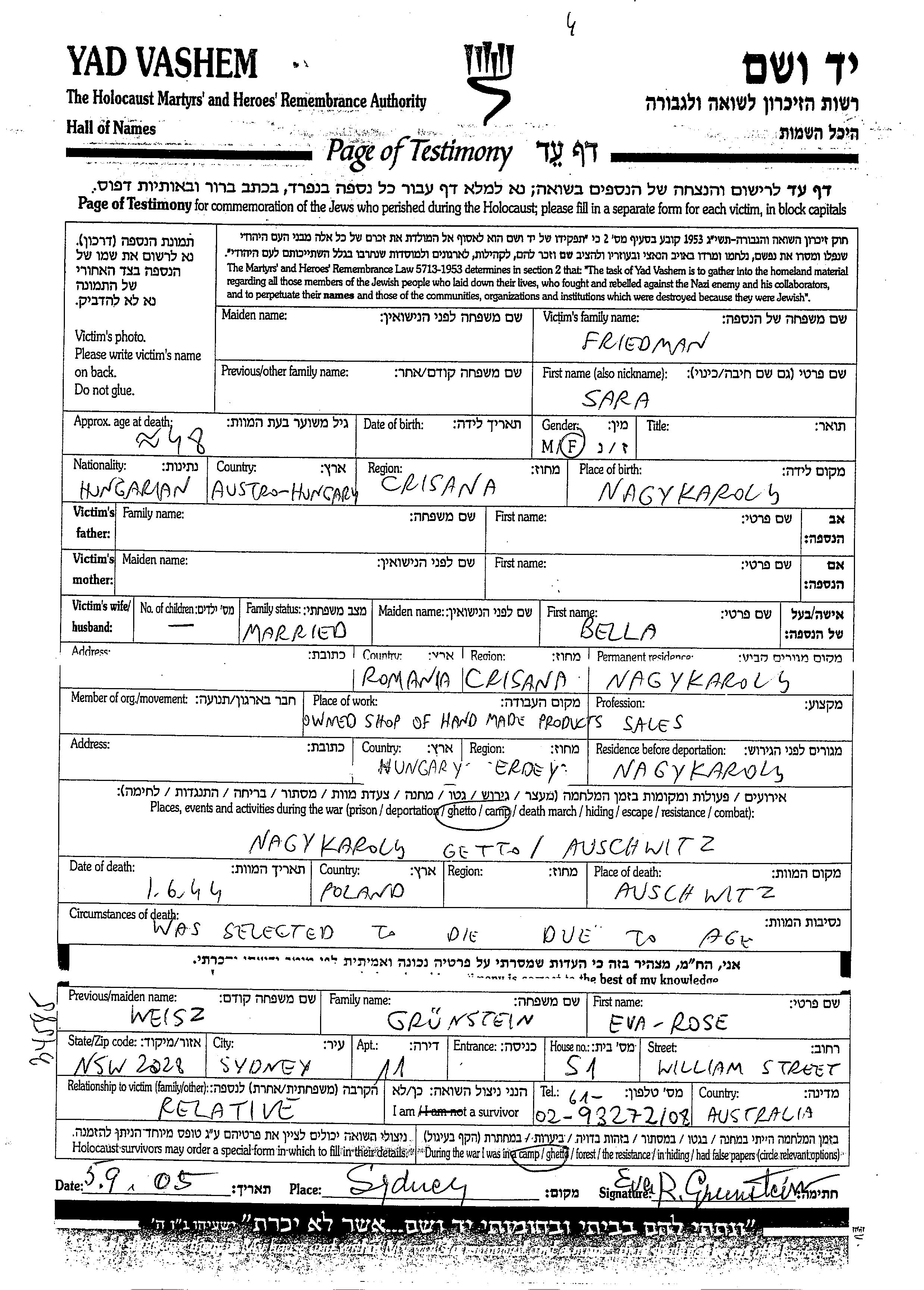 Friedman Sara Nagykaroly, Rumänien Gedenkblatt