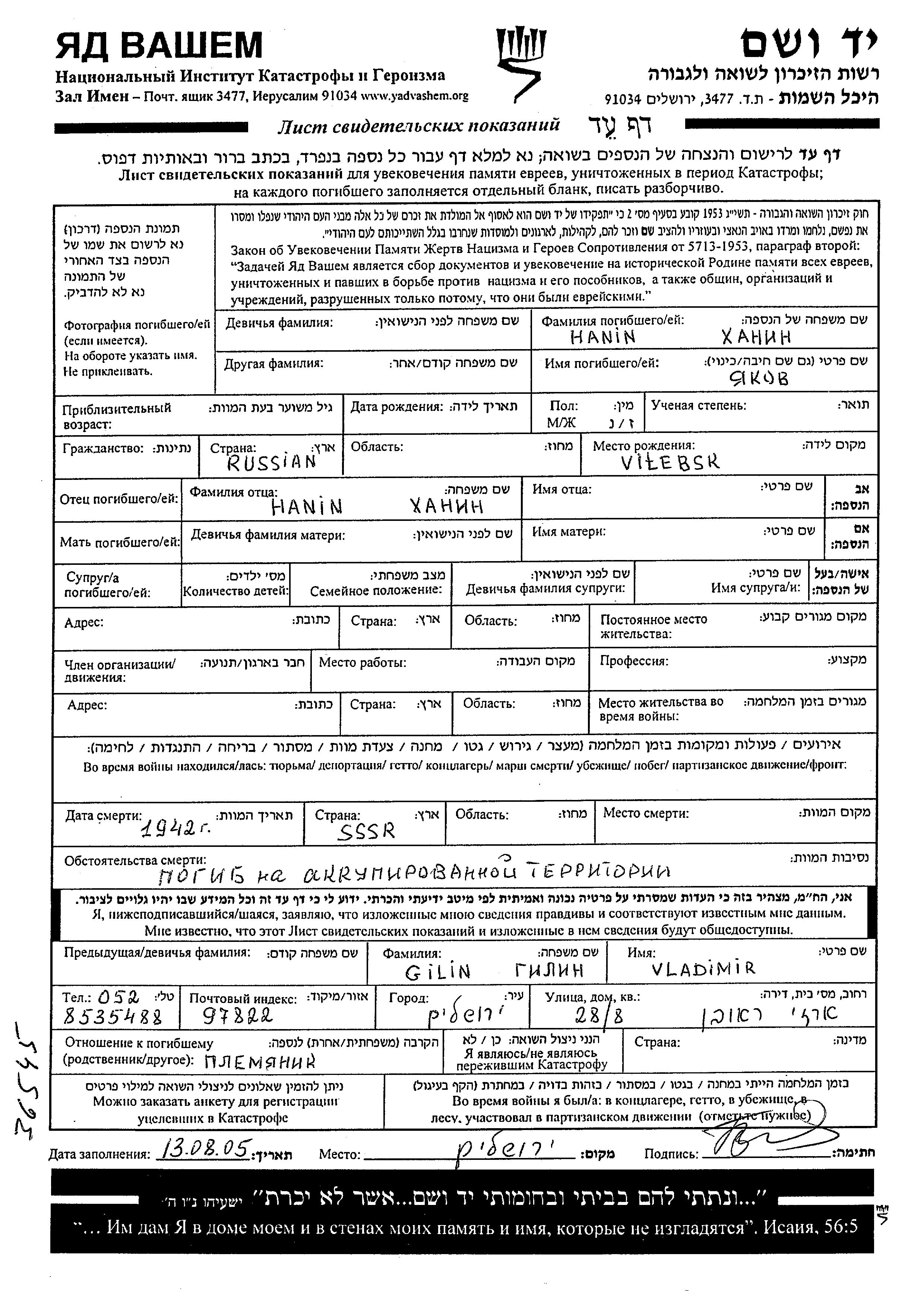 Yakov Khanin wurde in Vitebsk, Weißrussland (UdSSR) geboren. Vor dem Zweiten Weltkrieg lebte er in Vitebsk, Weißrussland (UdSSR). Während des Krieges war er in Weißrussland (UdSSR).