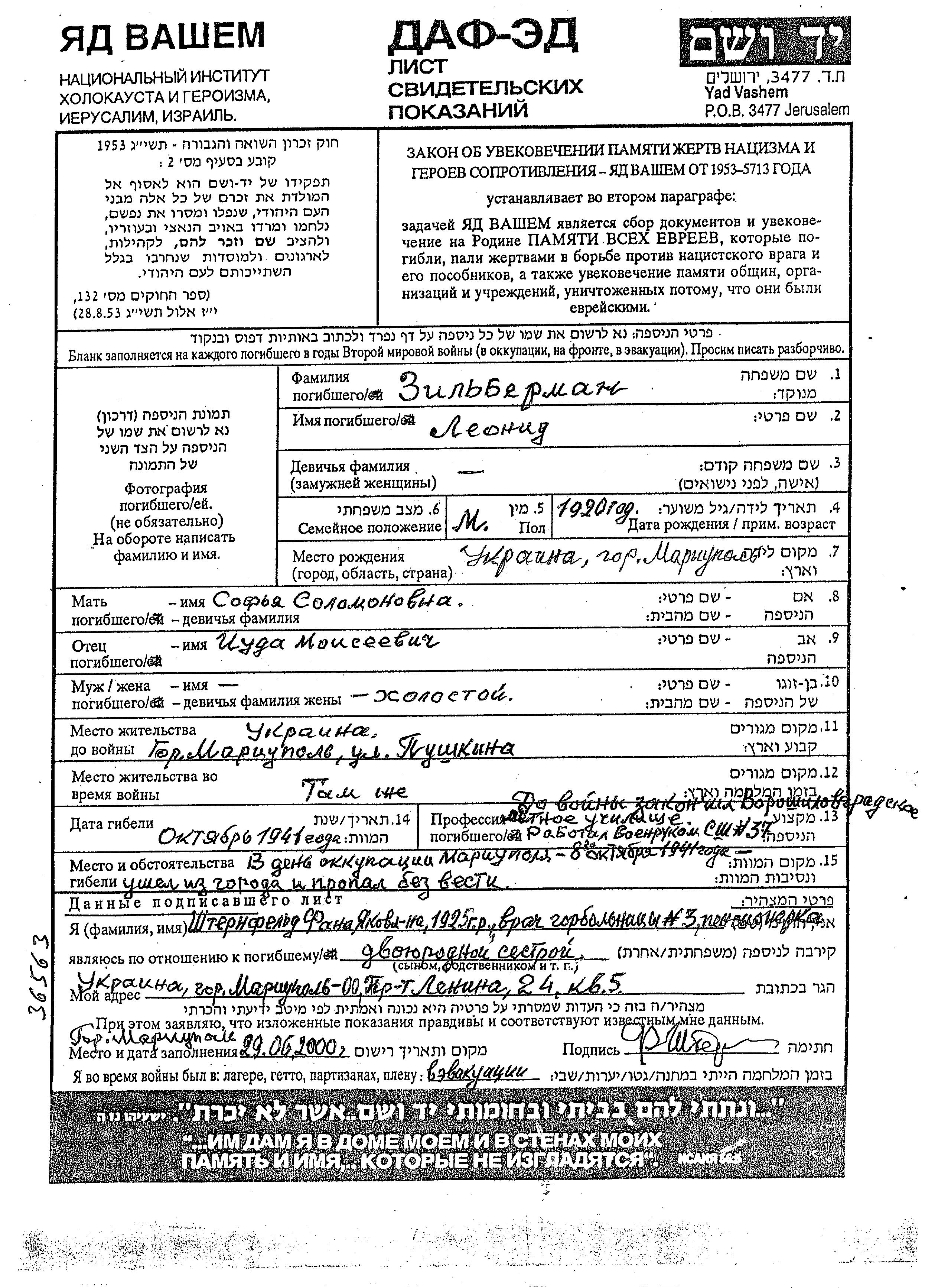 Leonid Zilberman wurde im Jahr 1920 in Mariupol, Ukraine (UdSSR) geboren. Er war der Sohn von Iuda und Sofya. Er war Lehrer/in und Ledig. Vor dem Zweiten Weltkrieg lebte er in Mariupol, Ukraine (UdSSR). Während des Krieges war er in Mariupol, Ukraine (UdSSR).