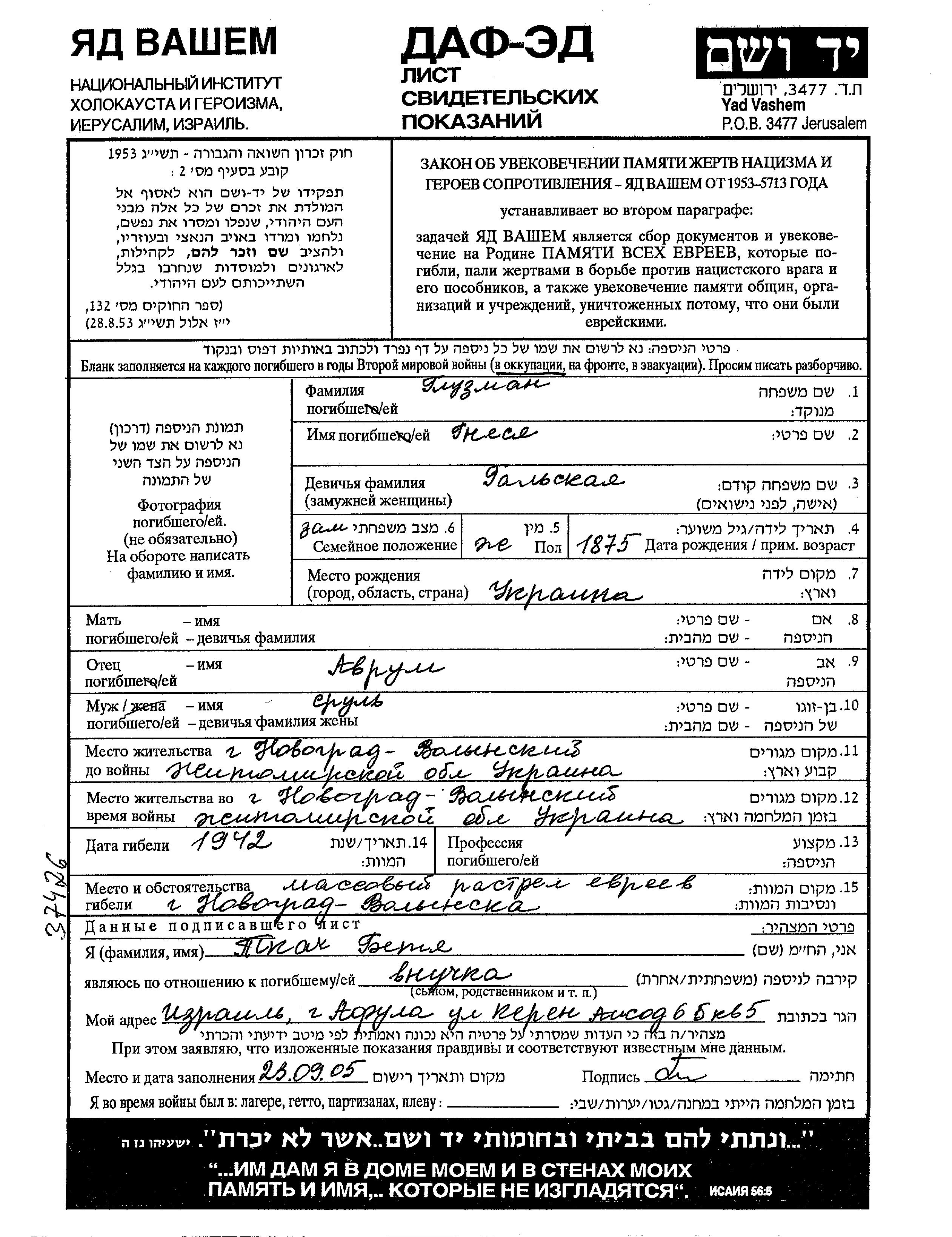 Gnesia Gluzman, geb. Galskaya wurde im Jahr 1875 in Ukraine (UdSSR) geboren. Sie war die Tochter von Avrum. Sie war mit Srul Verheiratet. Vor dem Zweiten Weltkrieg lebte sie in Novograd Volynsk, Ukraine (UdSSR). Während des Krieges war sie in Novograd Volynsk, Ukraine (UdSSR).