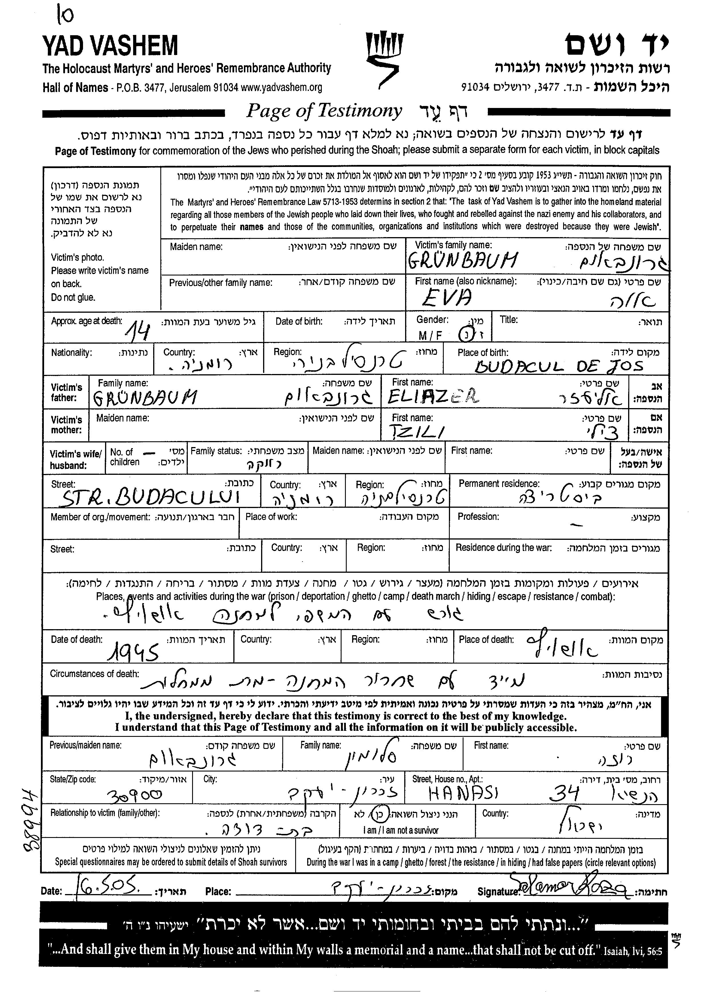 Eva Grunbaum wurde in Budacul de Jos, Rumänien geboren. Sie war die Tochter von Eliezer und Tzili. Sie war Ledig. Vor dem Zweiten Weltkrieg lebte sie in Bistrita Nasaud, Rumänien.