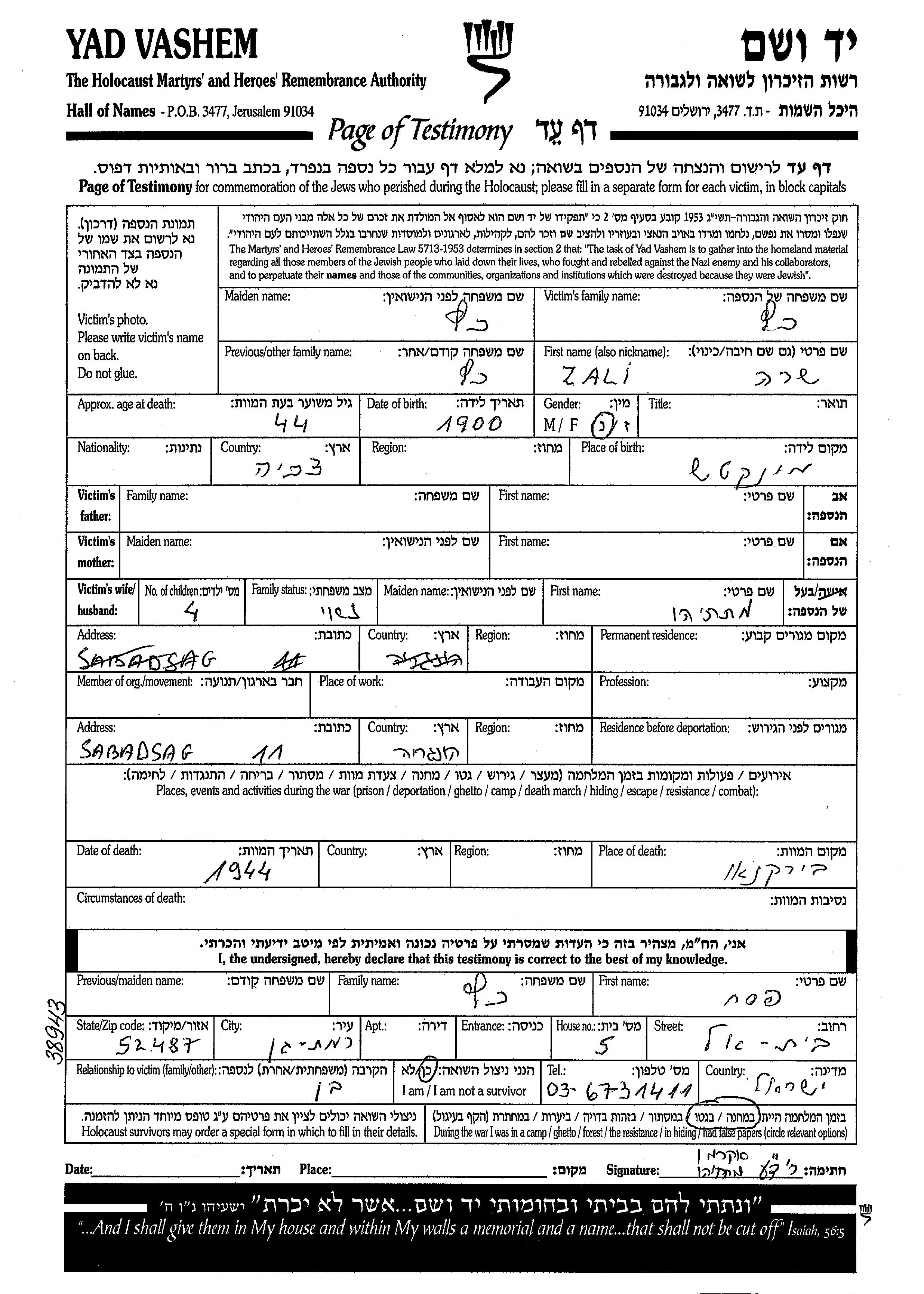 Sara Zali wurde in der Schoah ermordet. Todesort: Birkenau, Polen im Jahr 1944.