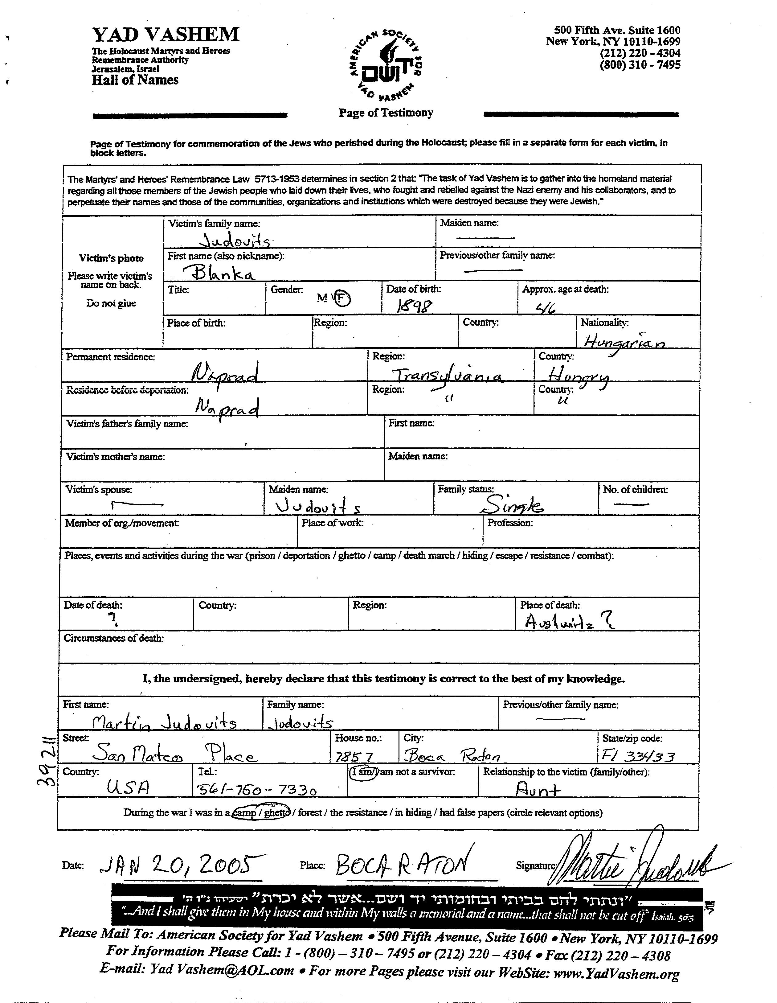 Blanka Judovits wurde im Jahr 1898 geboren. Sie war Ledig. Vor dem Zweiten Weltkrieg lebte sie in Naprad, Rumänien. Während des Krieges war sie in Naprad, Rumänien.