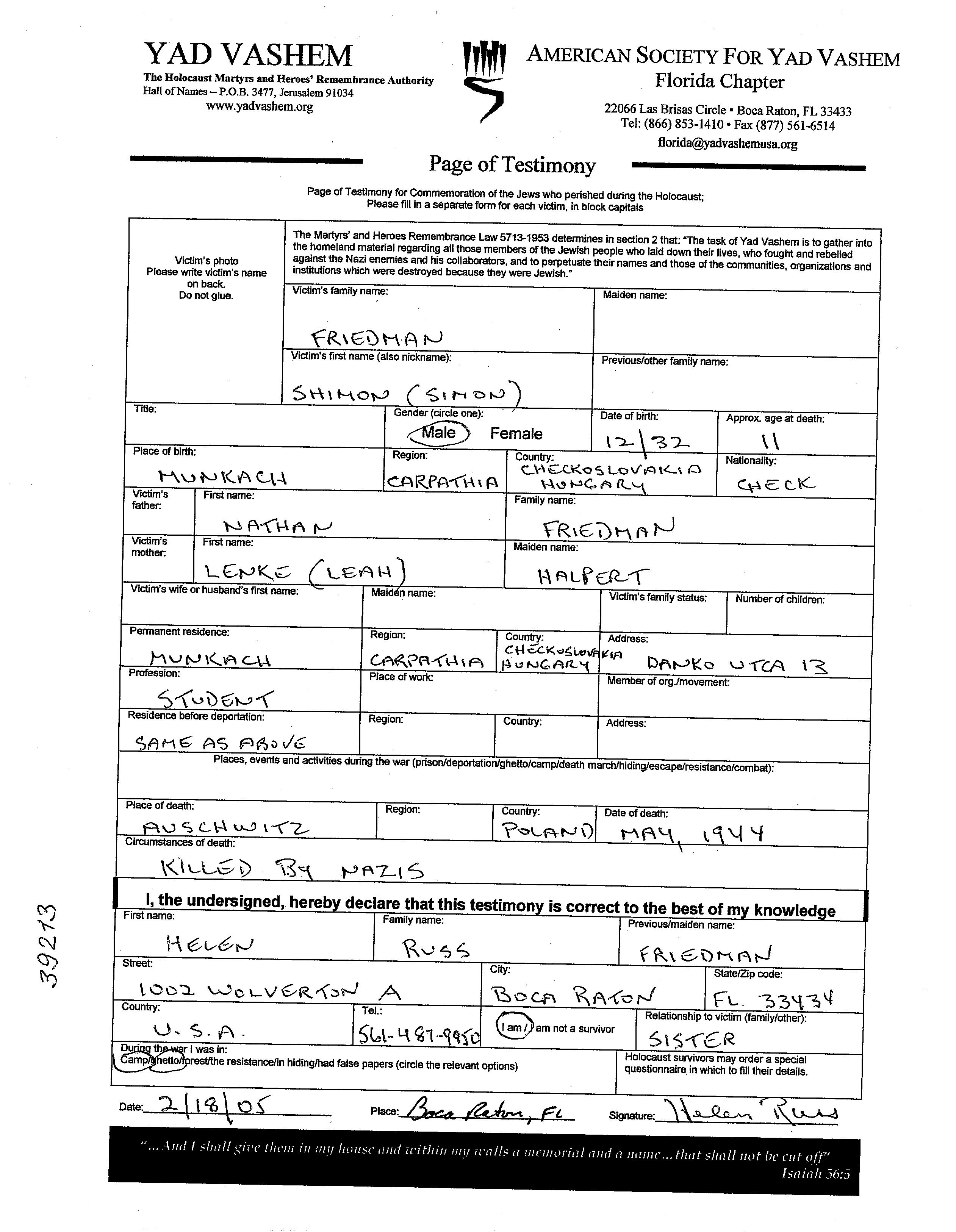 Simon Friedman wurde in Munkacs, Tschechoslowakei geboren. Er war der Sohn von Nathan und Leah Lenke, geb. Halpert. Er war Schüler/-in und Kind. Vor dem Zweiten Weltkrieg lebte er in Munkacs, Tschechoslowakei. Während des Krieges war er in Munkacs, Tschechoslowakei.