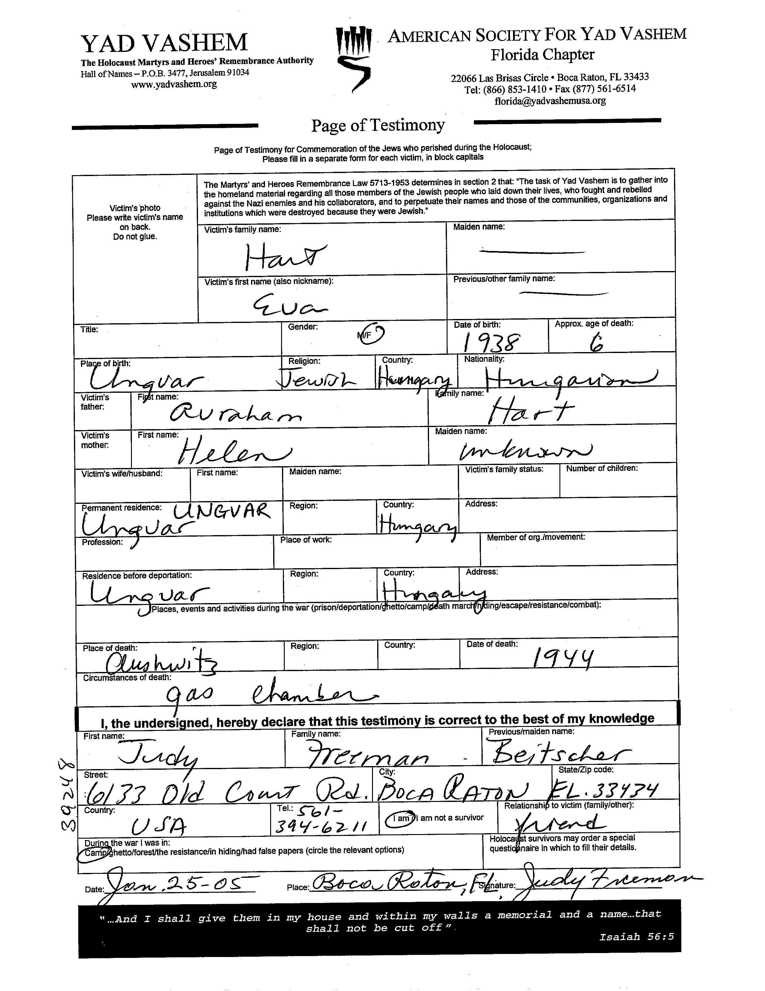 Eva wurde in der Schoah ermordet. Todesort: Auschwitz, Polen im Jahr 1944.