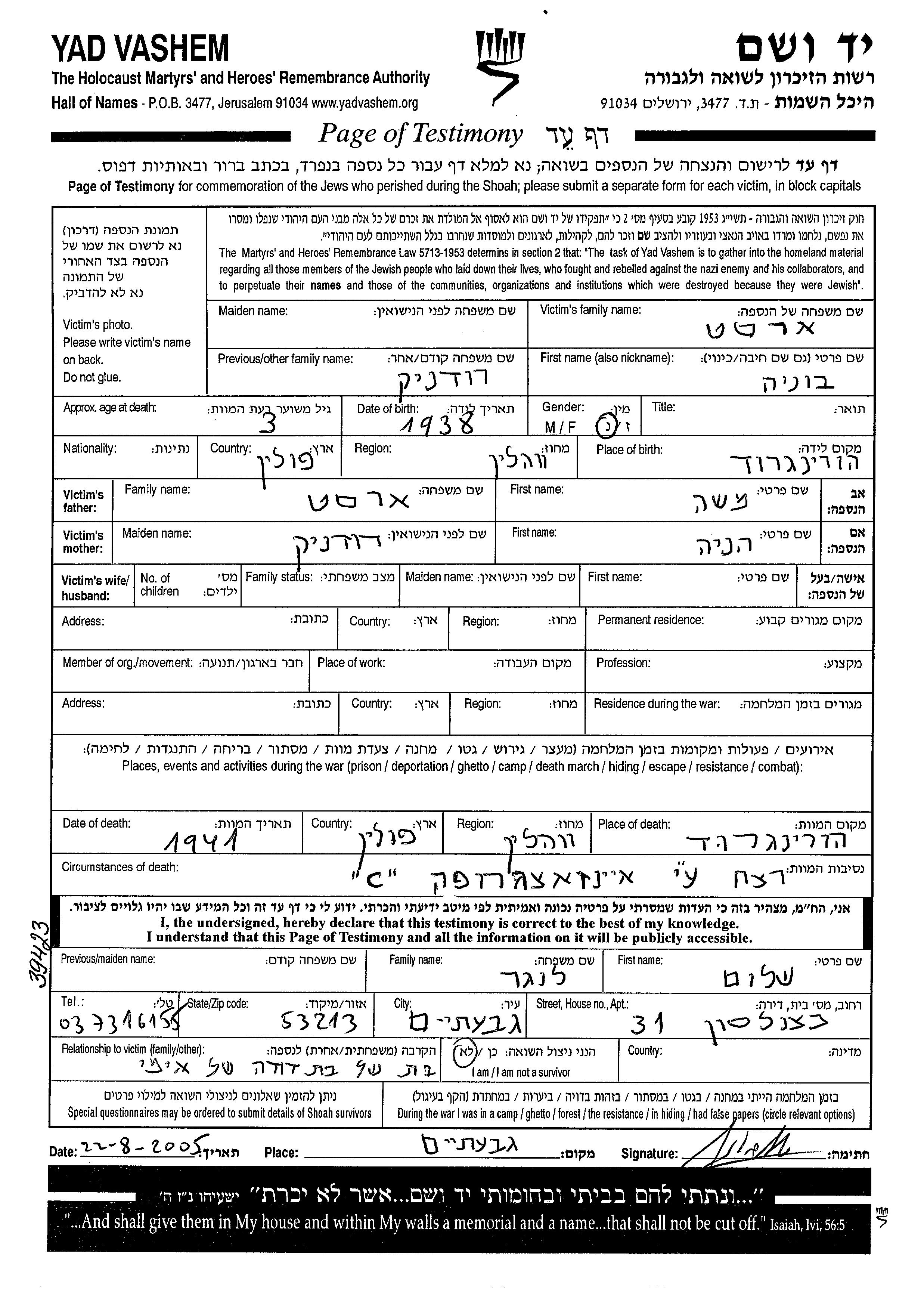 Bunia wurde in der Schoah ermordet. Todesort: Horyngrod, Polen im Jahr 1941.