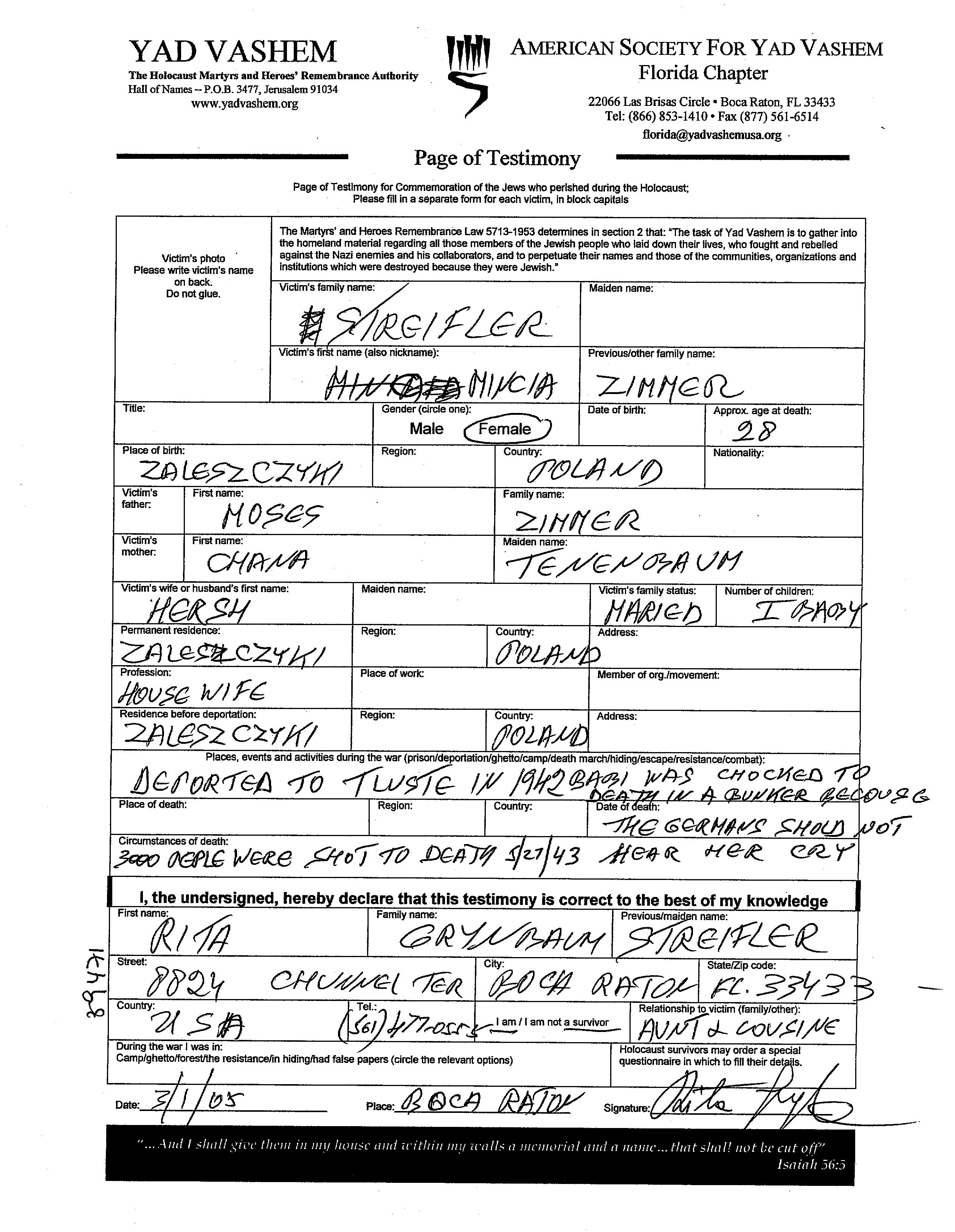 Mincia Streifler, geb. Zimmer wurde in Zaleszczyki, Polen geboren. Sie war die Tochter von Moses und Chana, geb. Tenenbaum. Sie war Hausfrau und mit Hersh Verheiratet. Vor dem Zweiten Weltkrieg lebte sie in Zaleszczyki, Polen. Während des Krieges war sie in Zaleszczyki, Polen.